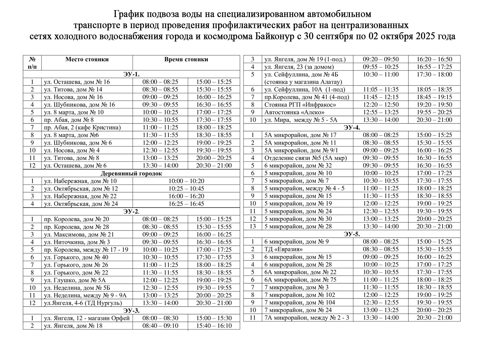Уважаемые жители города Байконур, поселков Торетам и Акай! В связи с проведением профилактических работ на централизованных сетях холодного водоснабжения города и космодрома Байконур в целях подготовки оборудования к эксплуатации в отопительный зимний период 2025–2026 гг. с 00:00 часов 30 сентября до 24:00 часов 2 октября (включительно) будет прекращена подача холодной воды потребителям на территории города и космодрома Байконур, поселков Торетам и Акай.