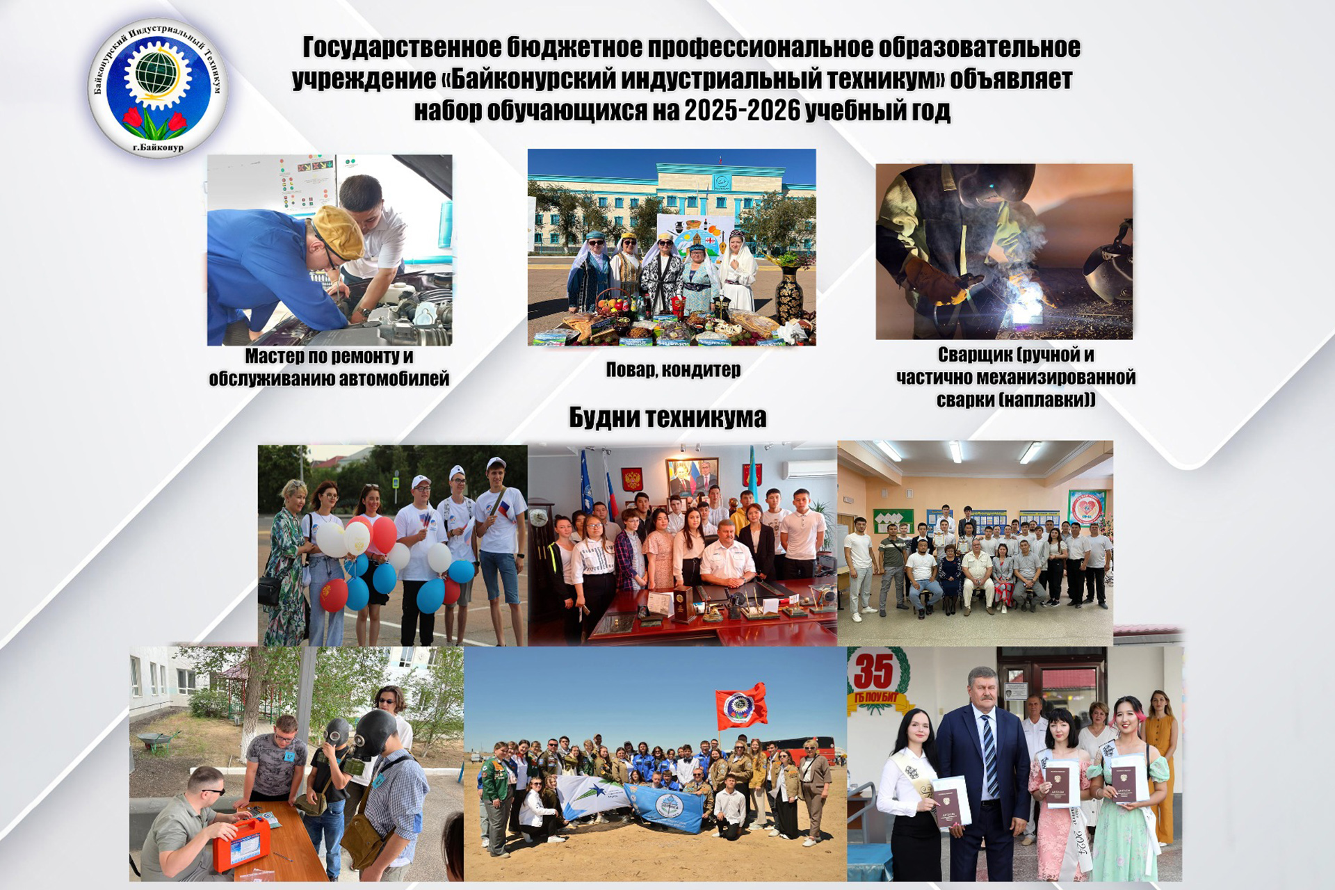 В связи с наличием свободных мест, Государственное бюджетное профессиональное образовательное учреждение «Байконурский индустриальный техникум» продолжает приём документов на 2025–2026 учебный год по образовательным программам среднего профессионального образования (программам подготовки квалифицированных рабочих, служащих).