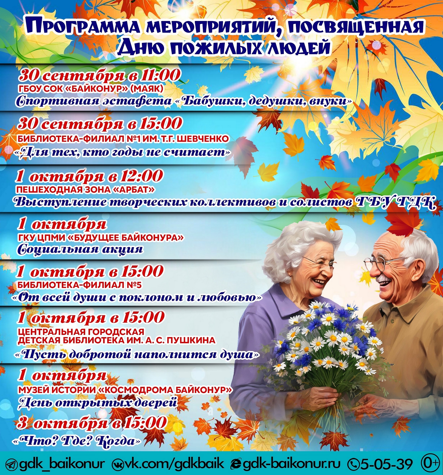 1 октября в Международный день пожилых людей на пешеходной зоне «Арбат» состоится концертная программа. Начало в 12:00. Людям «золотого возраста» будут предложены горячий чай и угощения. С 30 сентября по 3 октября в городе проводятся мероприятия, посвящённые Дню пожилых людей.