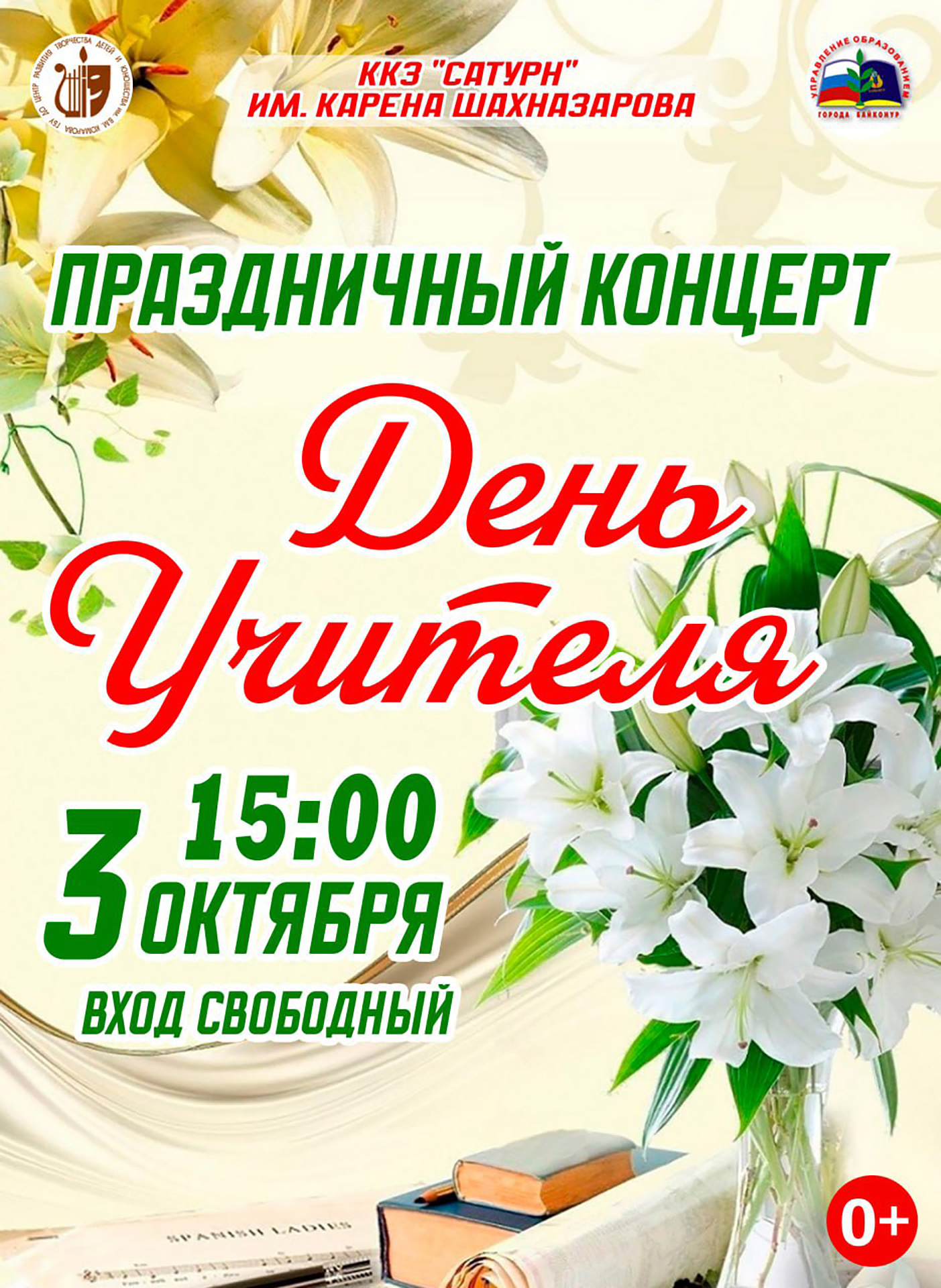 Уважаемые педагоги, жители и гости города! Приглашаем вас 3 октября в 15:00 на праздничный концерт «Мы в вас берём своё начало», посвящённый Дню учителя. Место проведения: ККЗ «Сатурн» им. Карена Шахназарова. В программе – яркие творческие выступления, музыкальные подарки и слова благодарности нашим дорогим учителям.