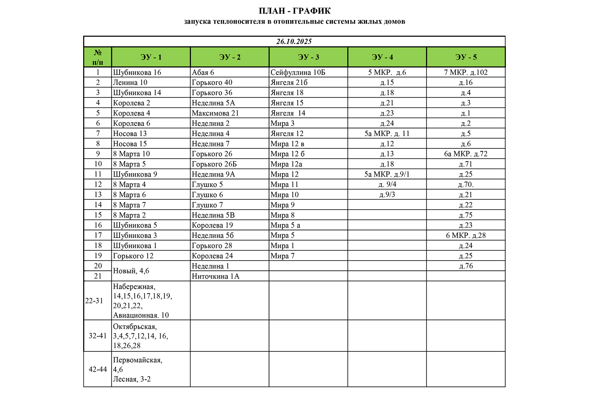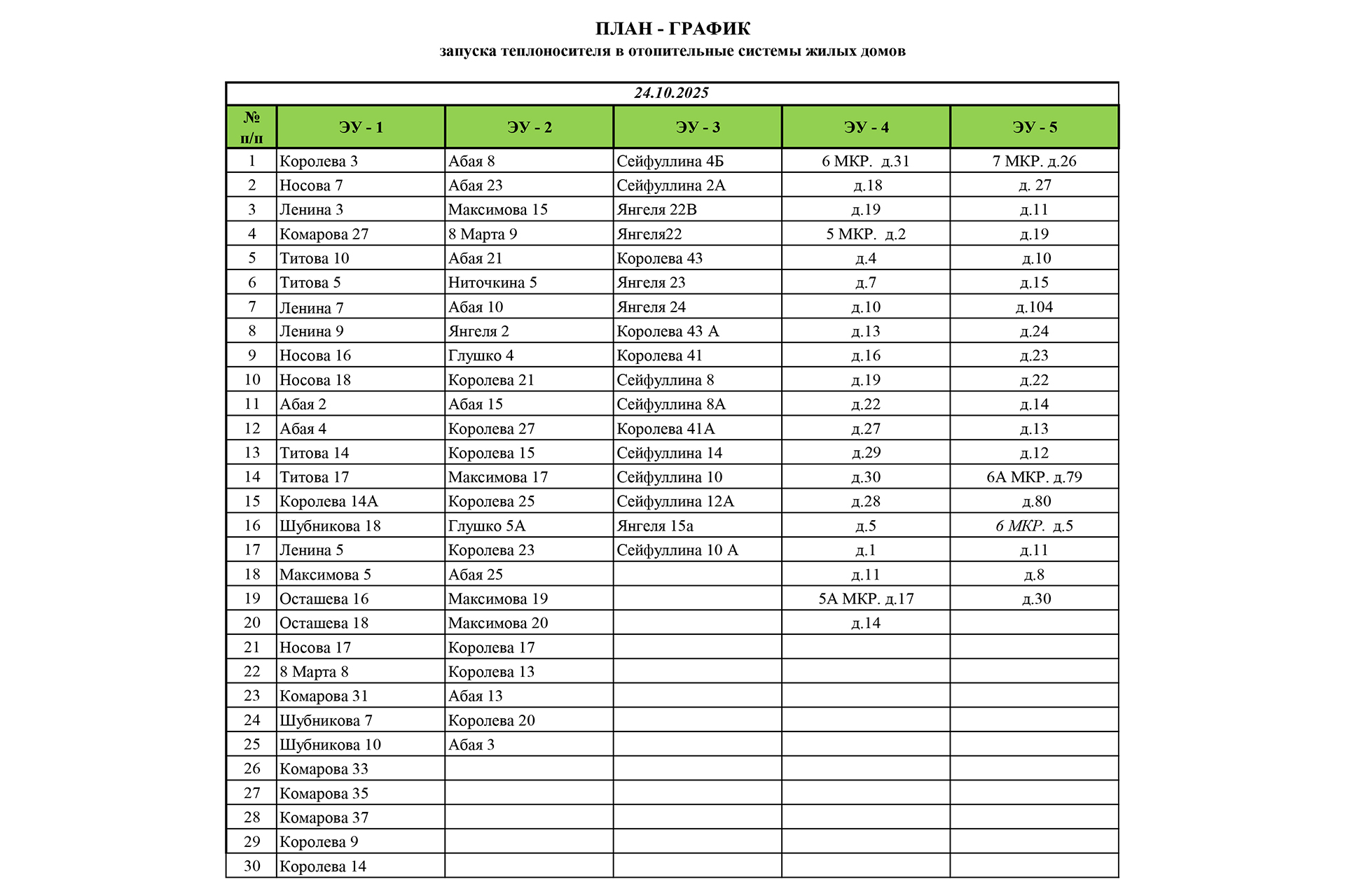 В период времени с 22 октября 2025 года тепловая энергия будет подана в социально значимые объекты (медицинские учреждения, образовательные учреждения, спортивные учреждения, учреждения культуры), расположенные на территории города Байконура.