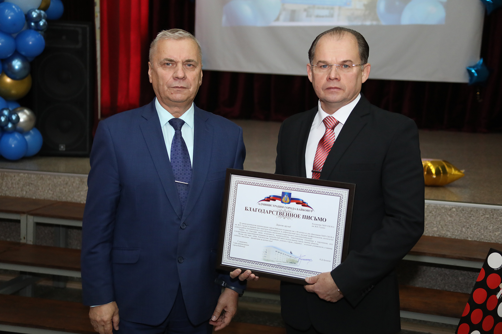 За многолетний добросовестный труд, большой вклад в дело обучения и воспитания подрастающего поколения города Байконура коллективу учебного заведения вручено благодарственное письмо главы администрации города Байконура. Настольными медалям «70 лет Байконуру» награждены директор школы Дмитрий Бражников, заместители директора по учебно-воспитательной работе Людмила Волкова, Айсулу Жумагулова и Елена Шалухо, заместитель директора по административно-хозяйственной работе Урумхан Кожанова, а также заместитель директора по безопасности Азиз Рагибов. Ряд работников школы удостоены почетных грамот и благодарностей главы администрации.