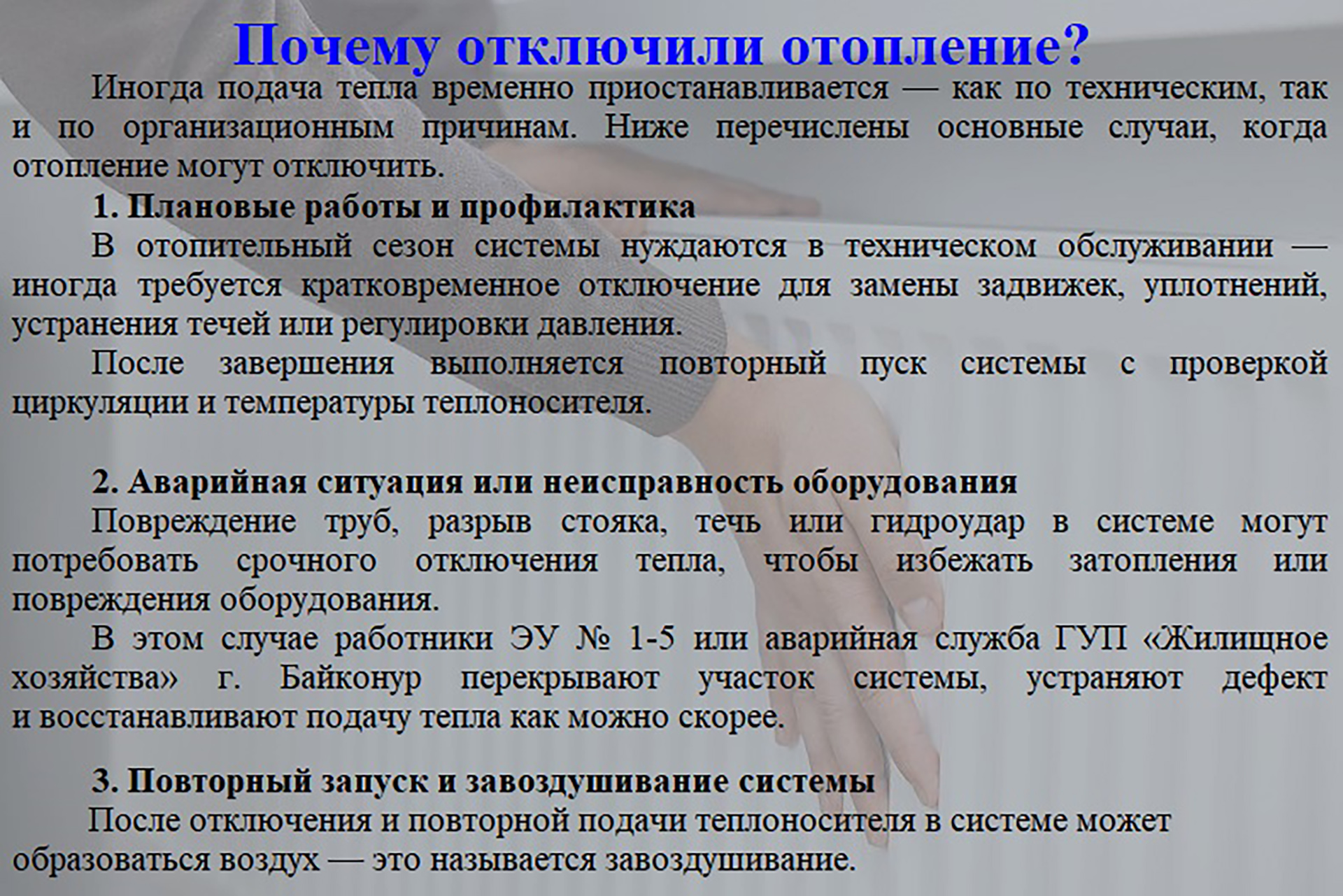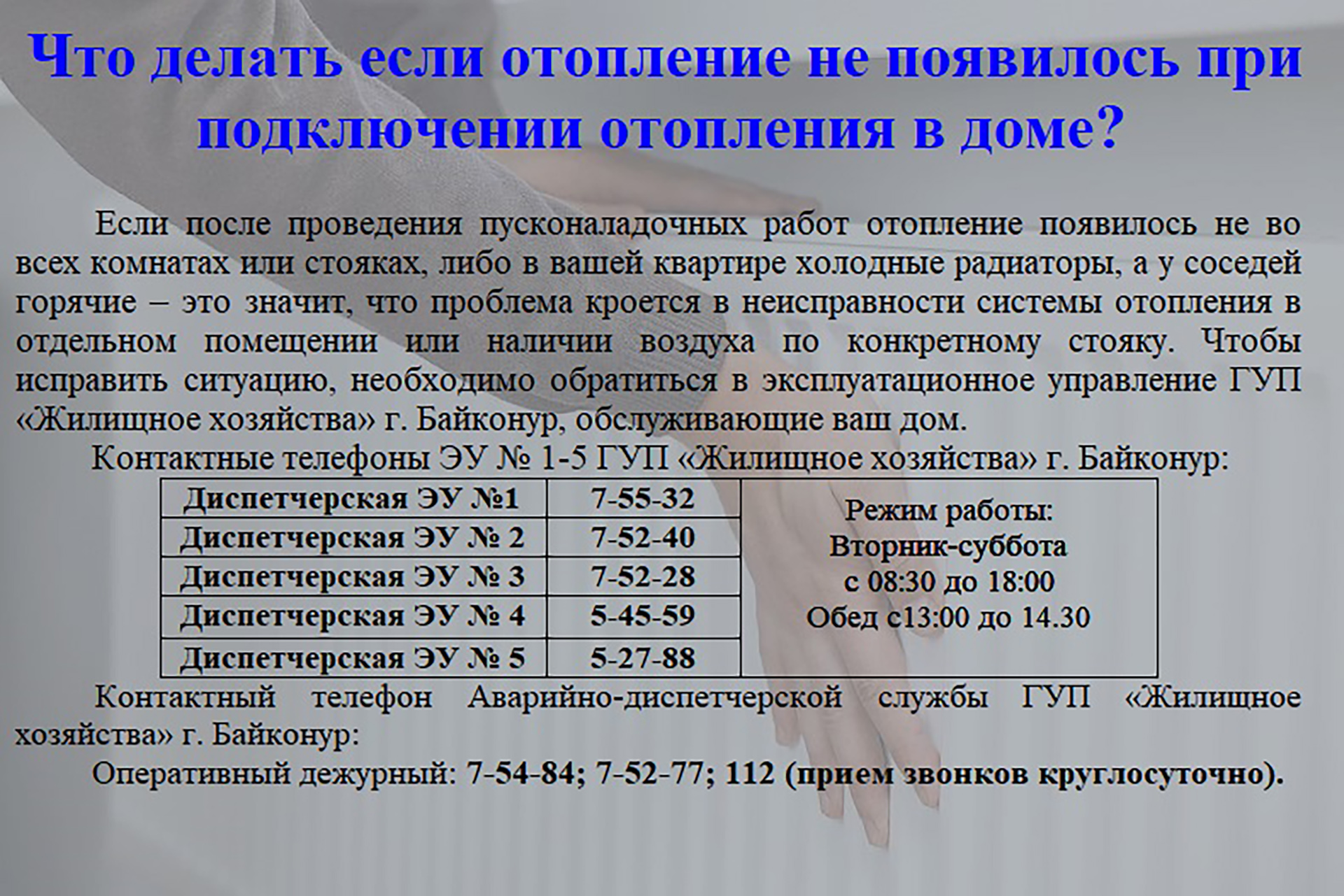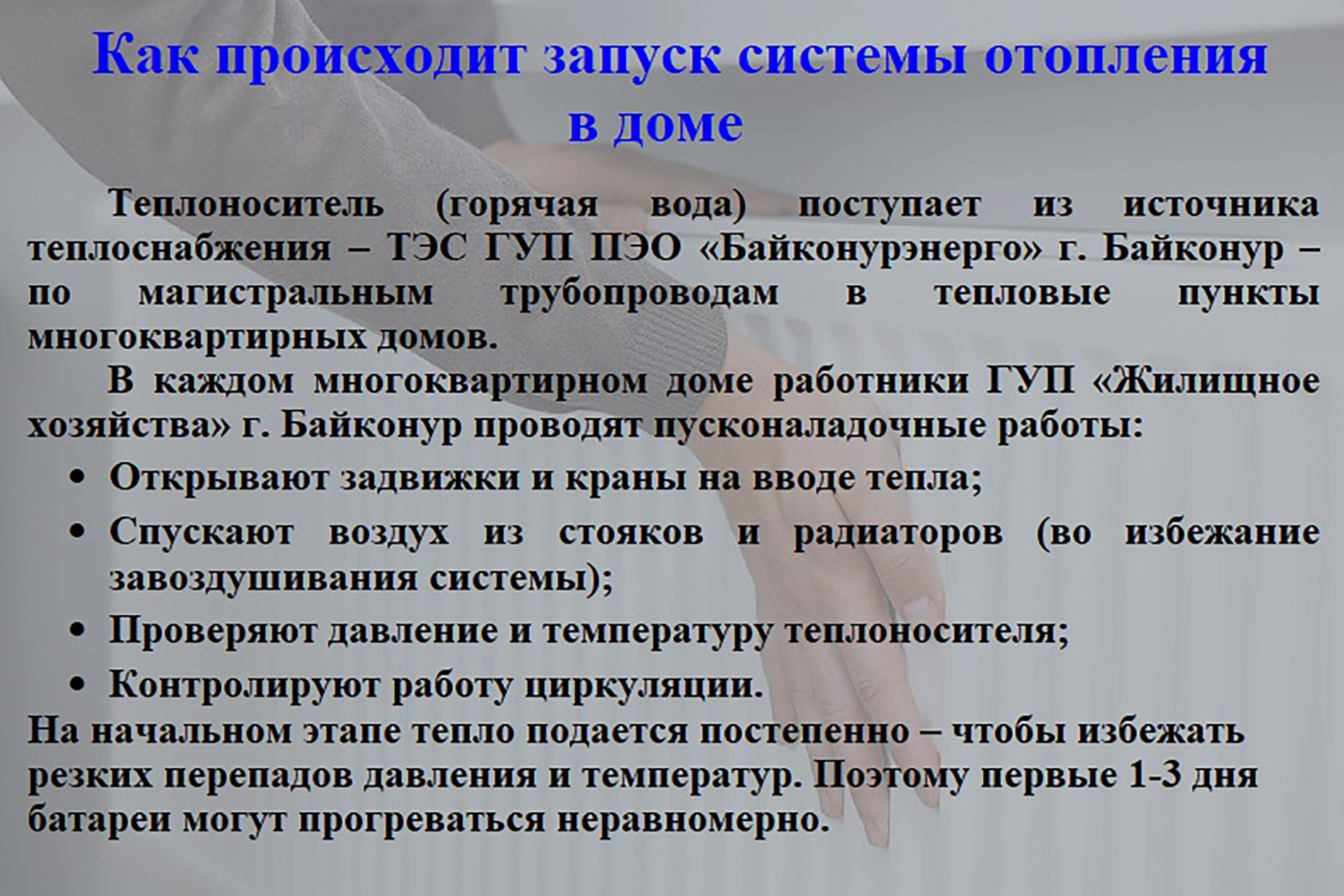 Управлением городского хозяйства администрации города Байконур подготовлены разъяснения о функционировании систем теплоснабжения в многоквартирных домах (смотрите в карточках).