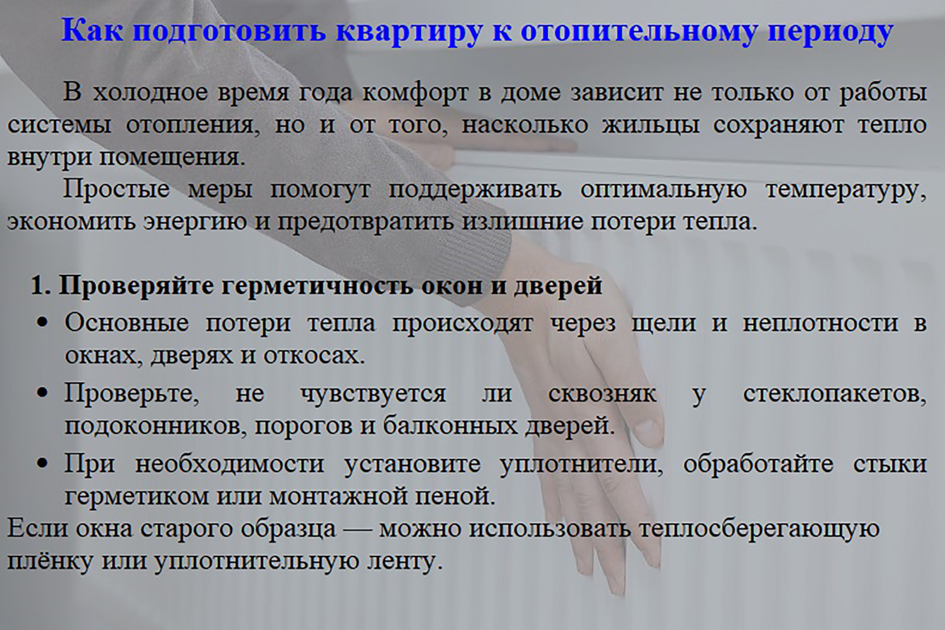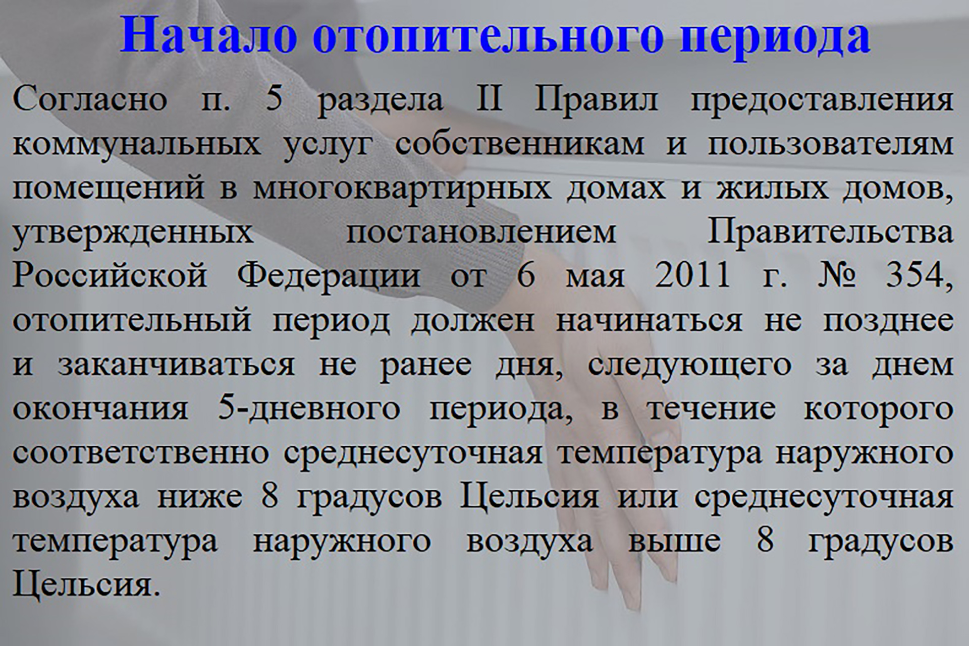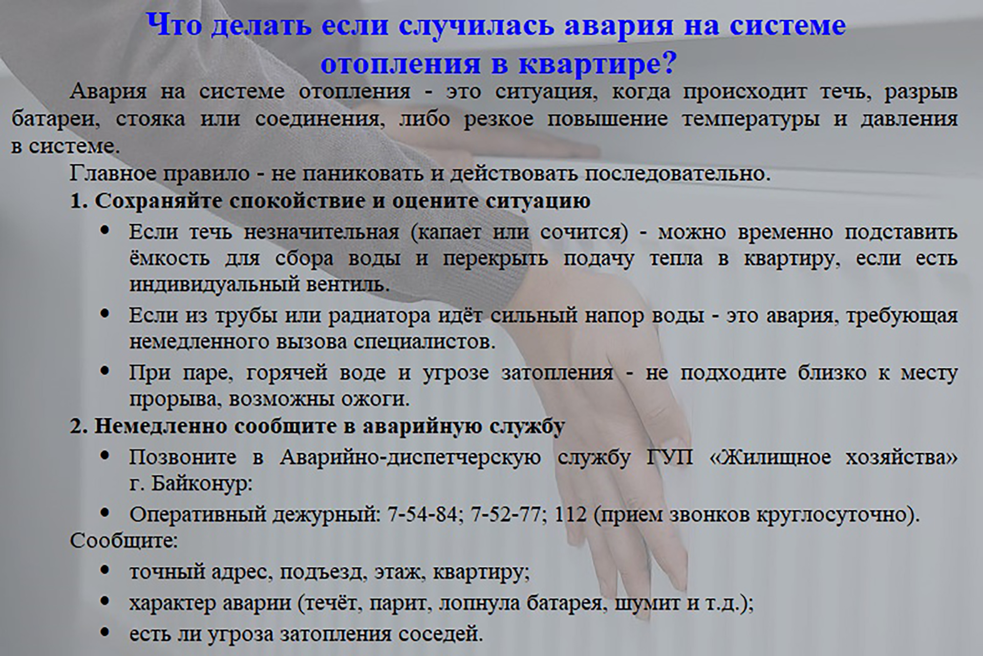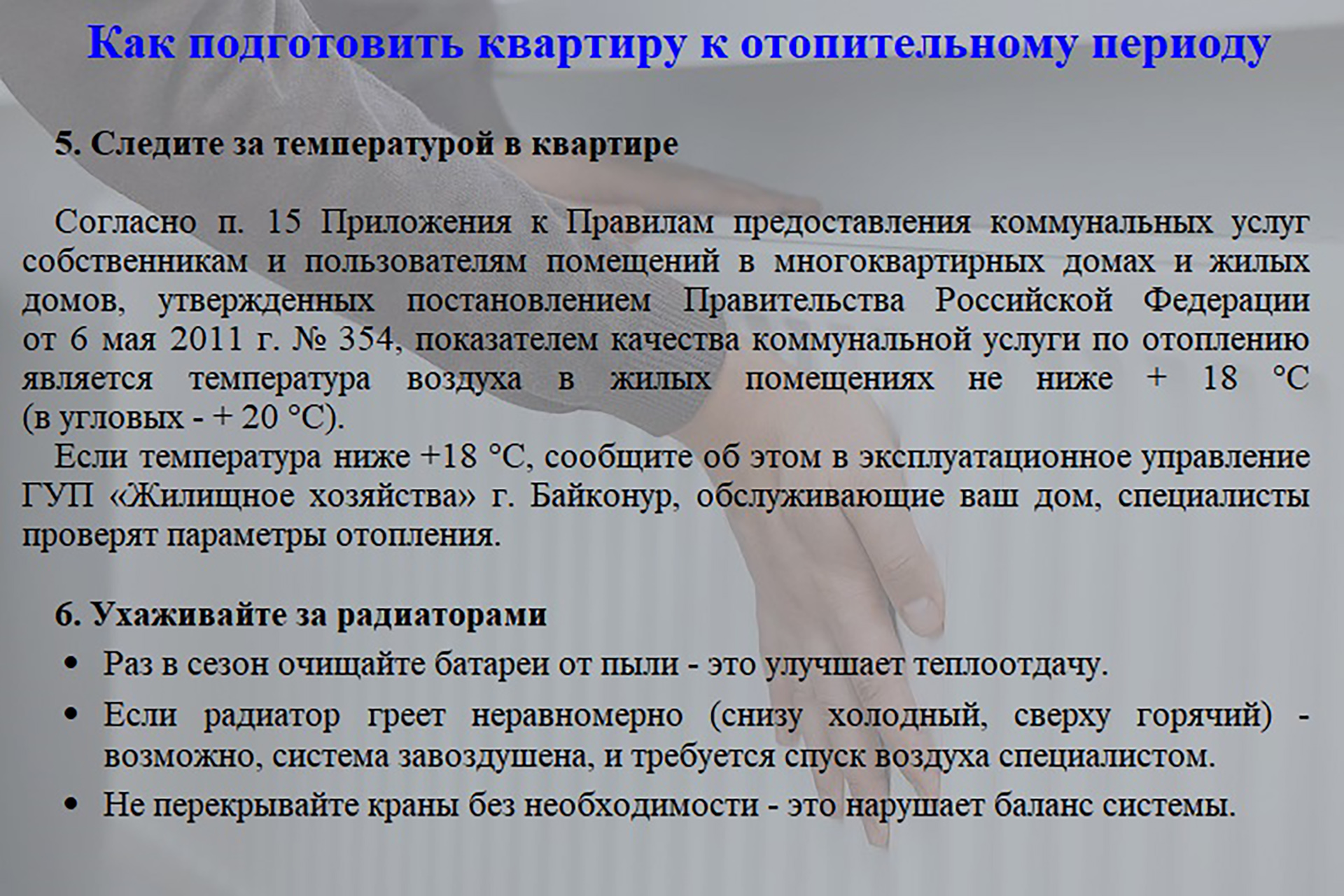 Управлением городского хозяйства администрации города Байконур подготовлены разъяснения о функционировании систем теплоснабжения в многоквартирных домах (смотрите в карточках).