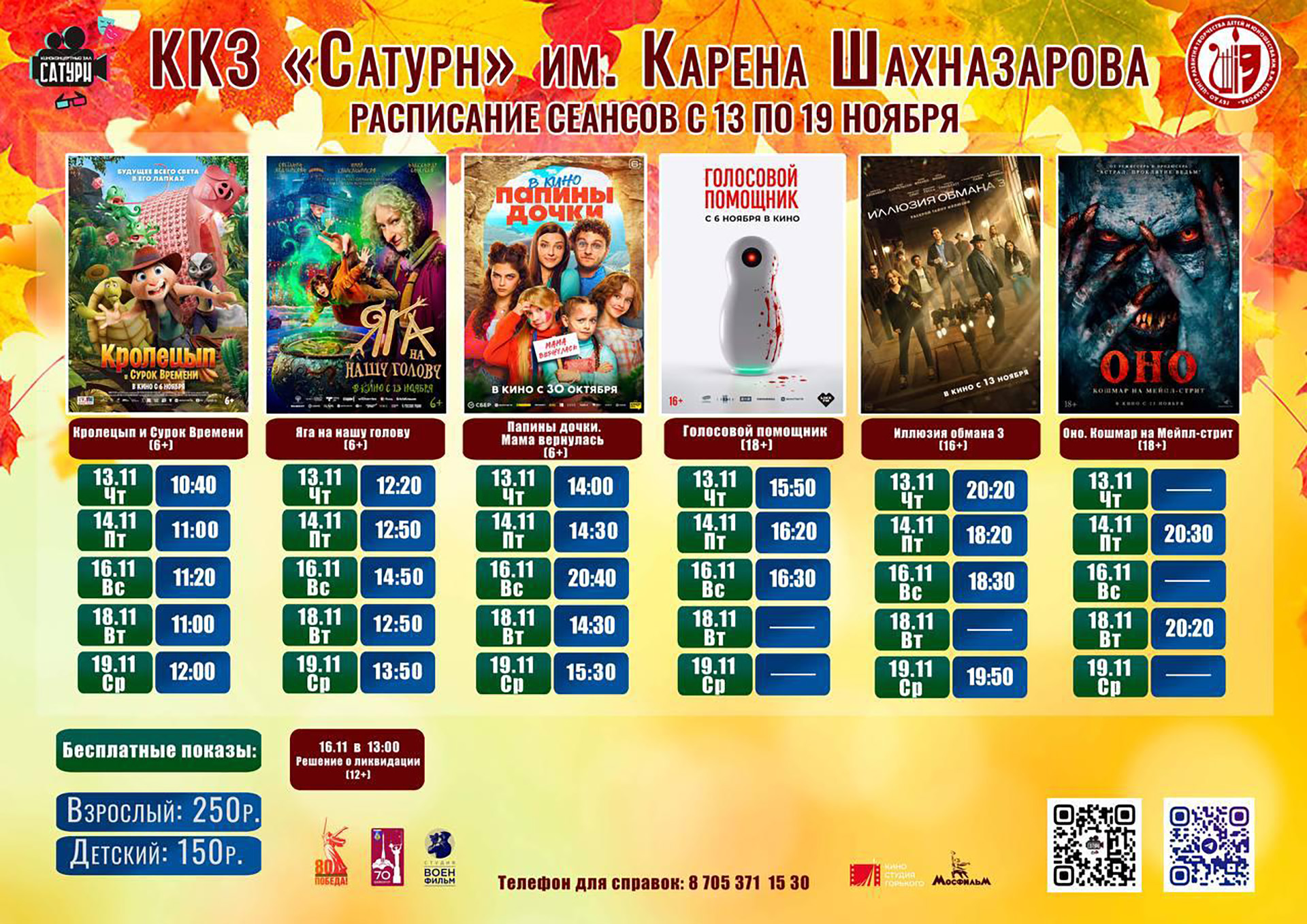 13.11.2025  Киноконцертный зал «Сатурн» приглашает жителей и гостей города на просмотр фильмов