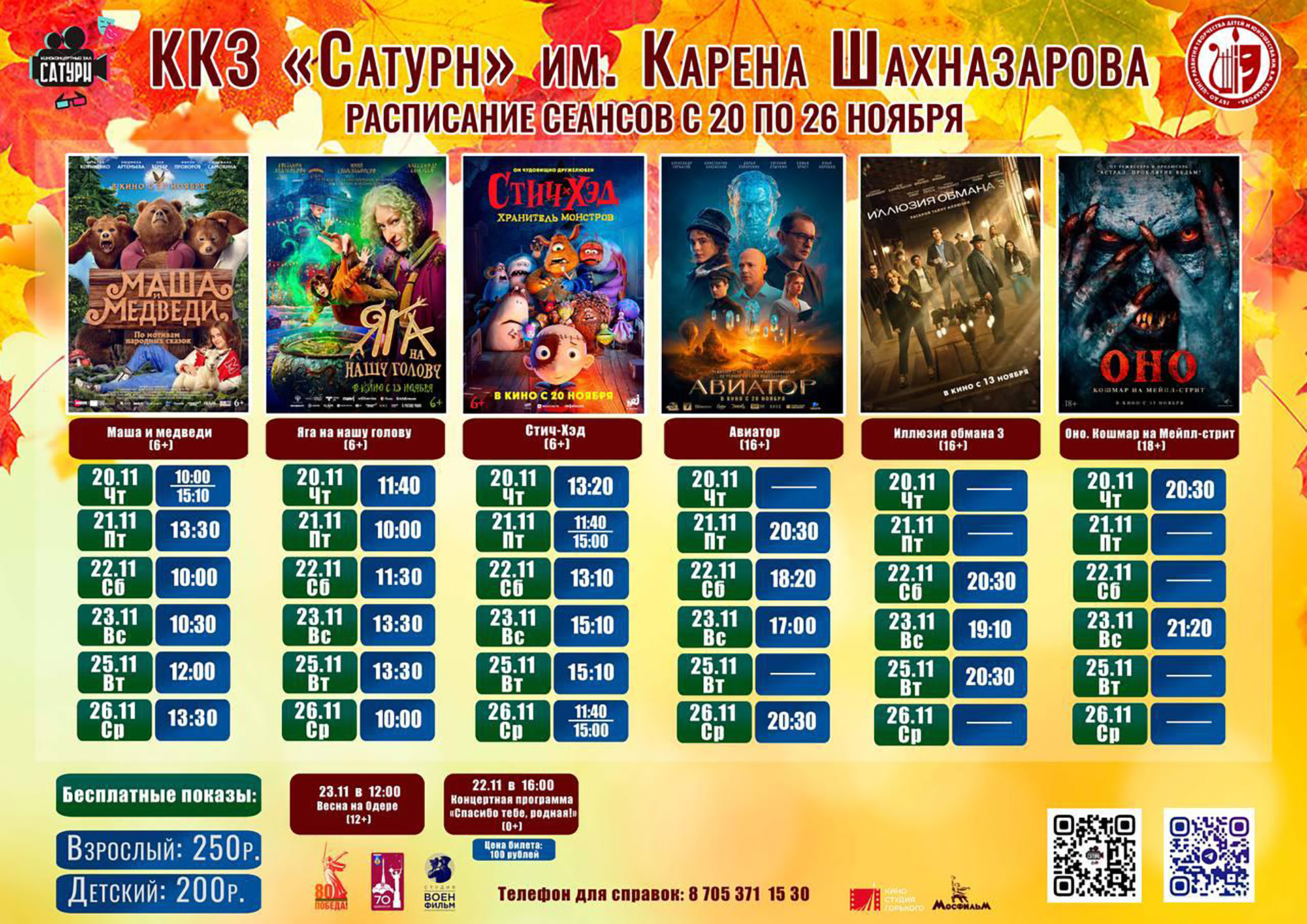 20.11.2025  Киноконцертный зал «Сатурн» приглашает жителей и гостей города на просмотр фильмов
