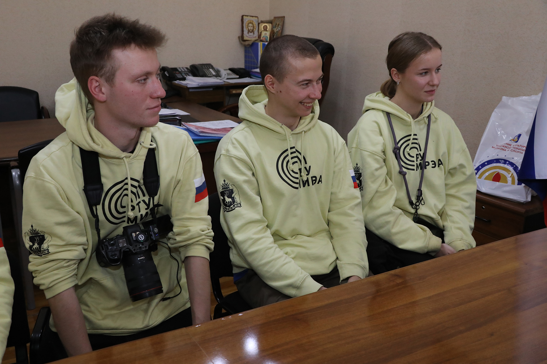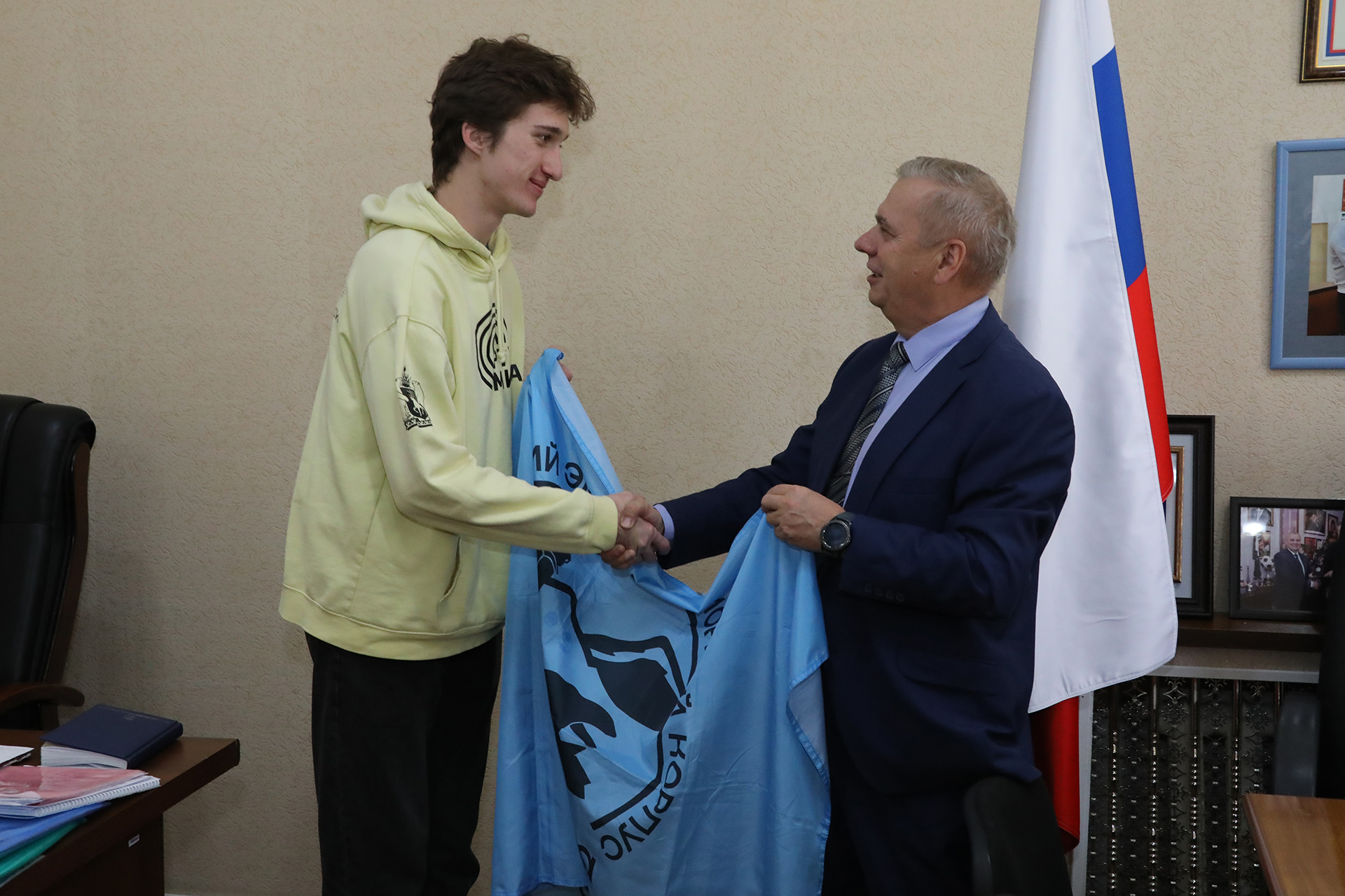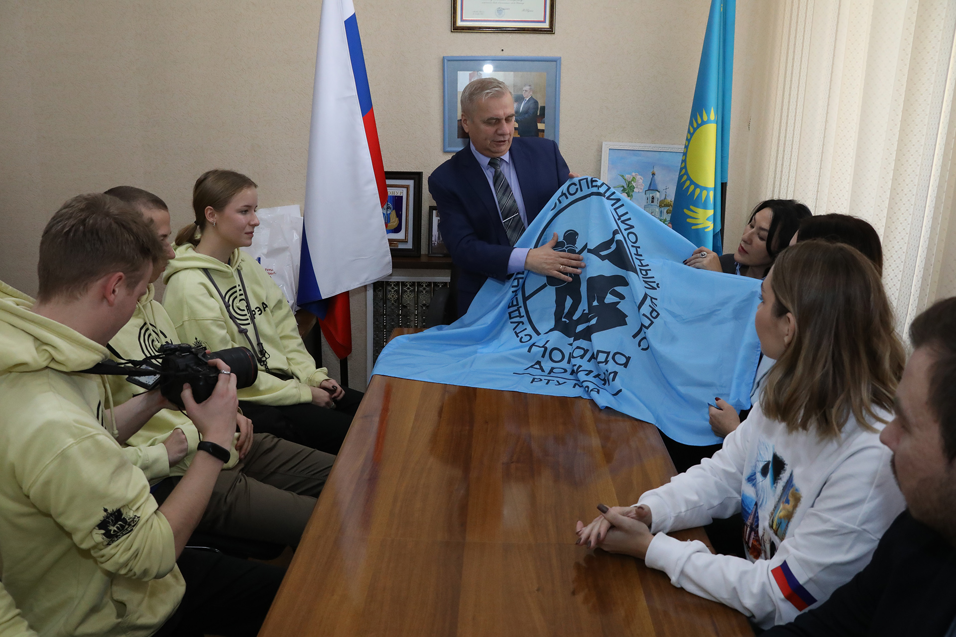 В торжественной обстановке Николай Адасёв передал ребятам флаг студенческого экспедиционного корпуса «Команда Арктики» РТУ МИРЭА, побывавший в космосе.