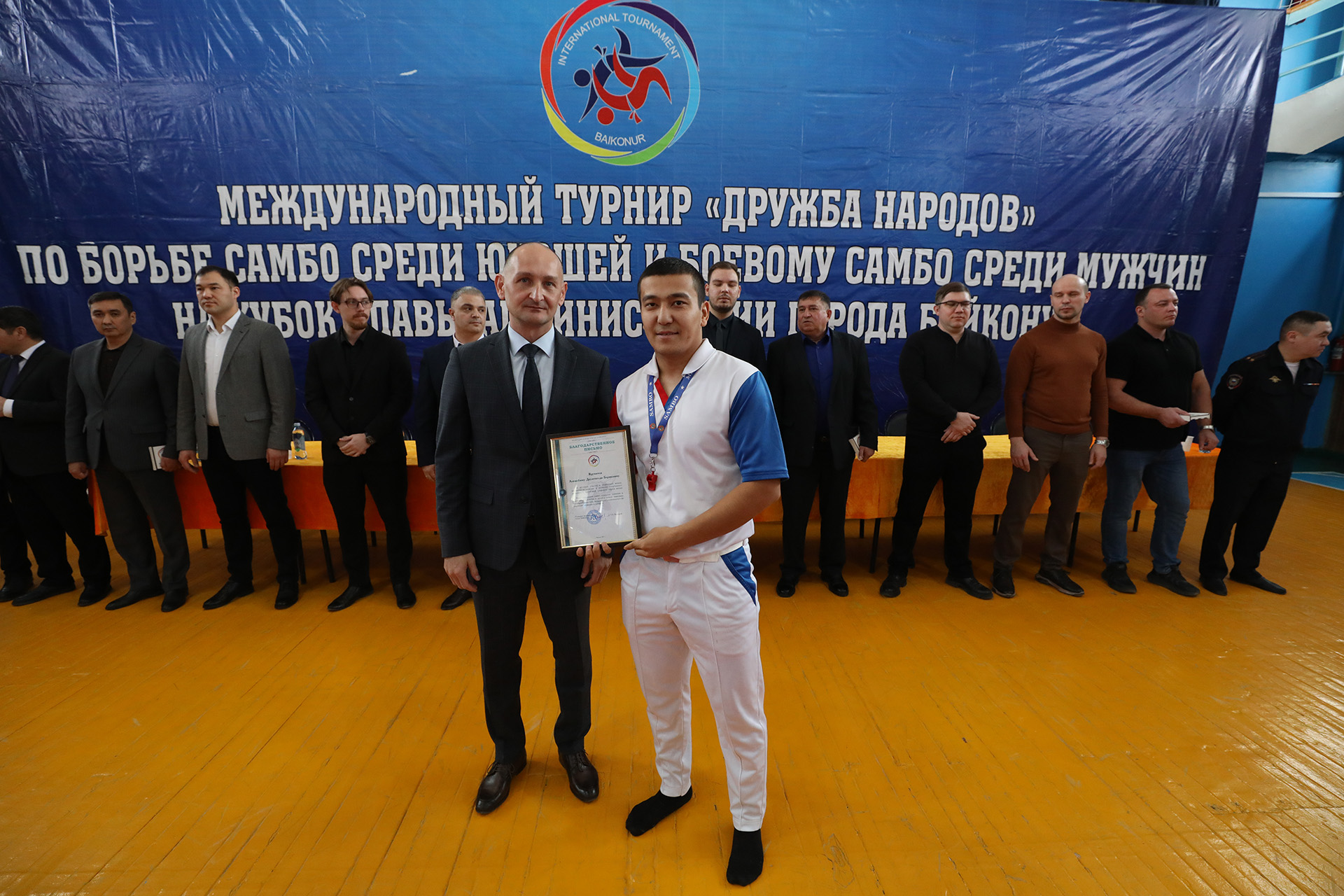 Первый заместитель главы администрации города вручил почетным гостям памятные медали за активное участие, поддержку и вклад в развитие спорта. Также от его имени были вручены благодарственные письма за высокие достижения, упорный труд, огромный вклад в развитие спортивных традиций города, стремление к победе и достойное представление спортивной школы. Награды получили тренеры и воспитанники отделения самбо – те, кто ежедневно трудится, преодолевает себя и отстаивает честь Байконура на спортивной арене. Особые слова благодарности были адресованы главному судье соревнований, преподавателю по самбо и мастеру спорта РК по самбо Амангелди Арысову, а также главному секретарю соревнования, судье национальной категории и тренеру-преподавателю Даулеткелди Алпысбаеву за безупречную организацию, профессионализм и преданность своему делу.