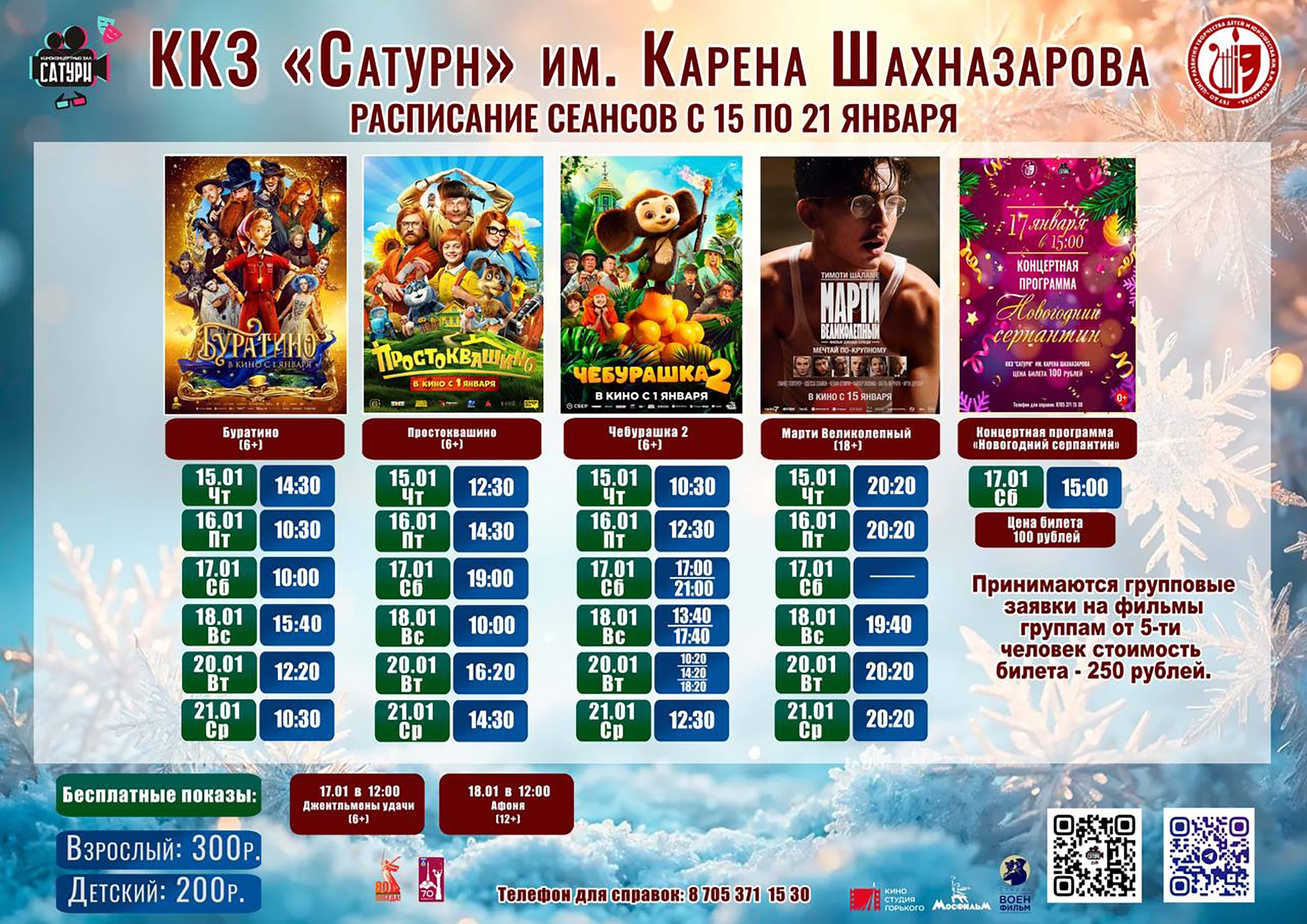 15.01.2026  Киноконцертный зал «Сатурн» приглашает жителей и гостей города на просмотр фильмов