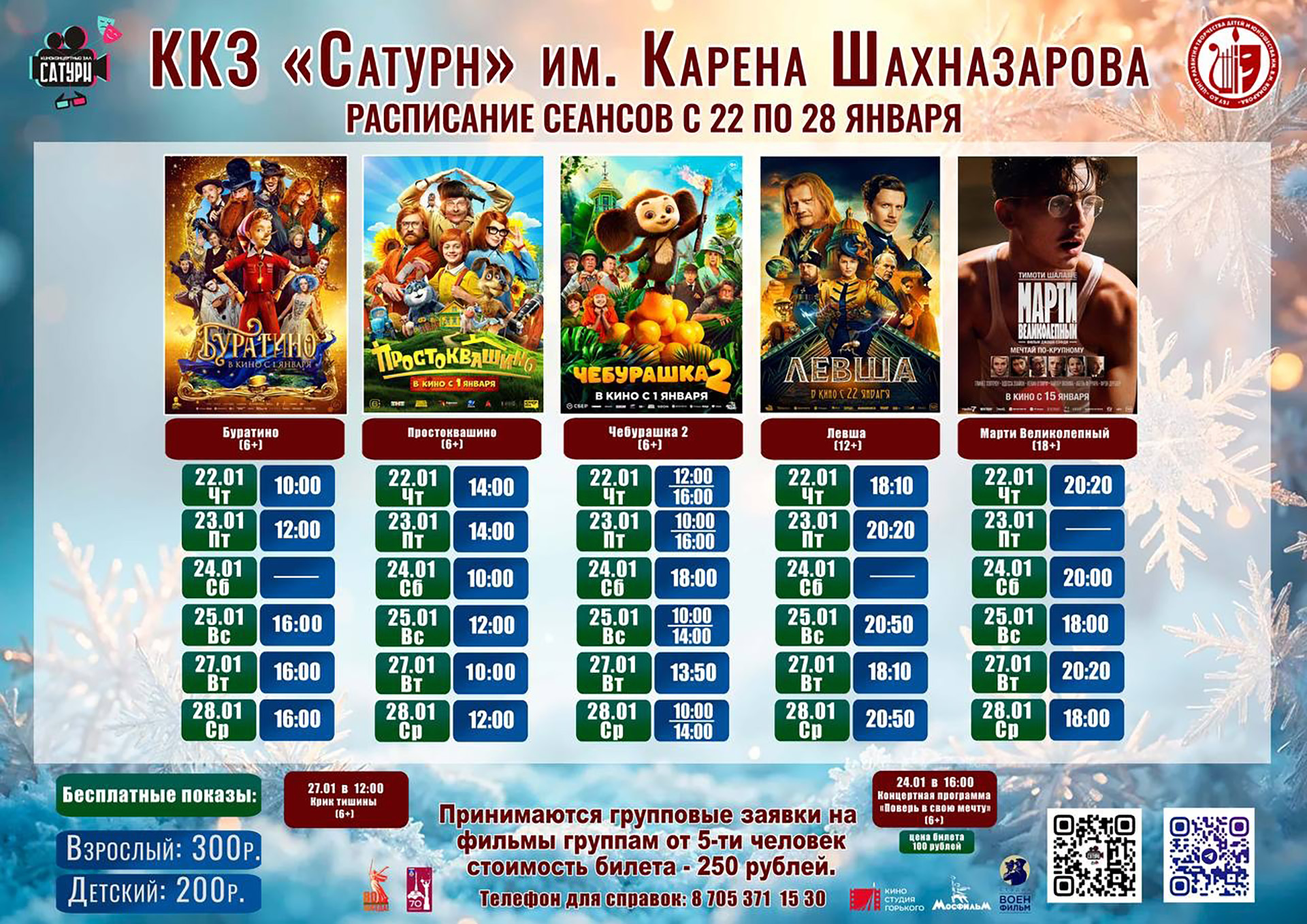 22.01.2026  Киноконцертный зал «Сатурн» приглашает жителей и гостей города на просмотр фильмов