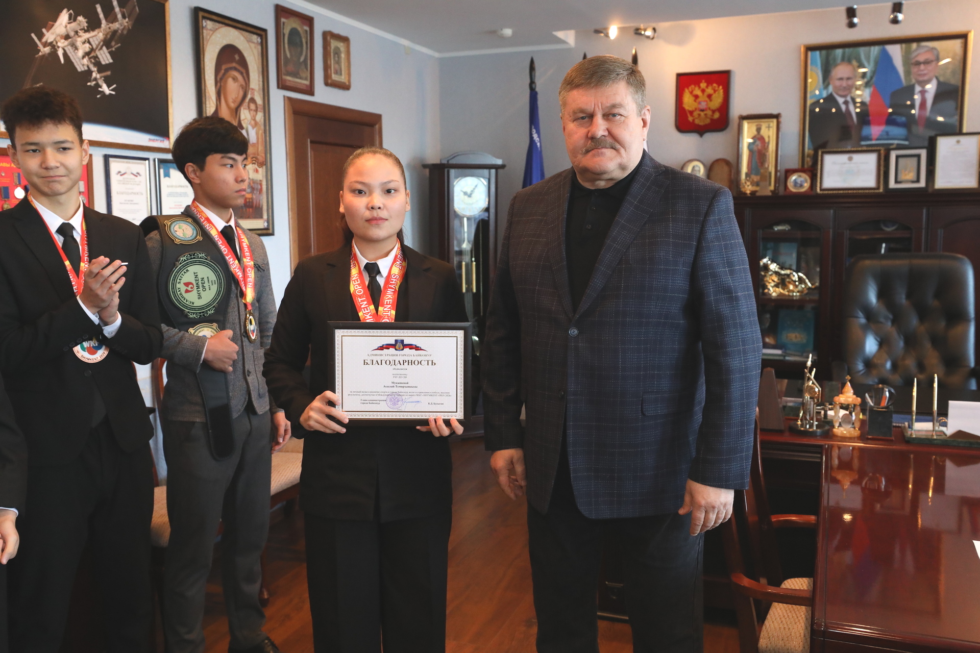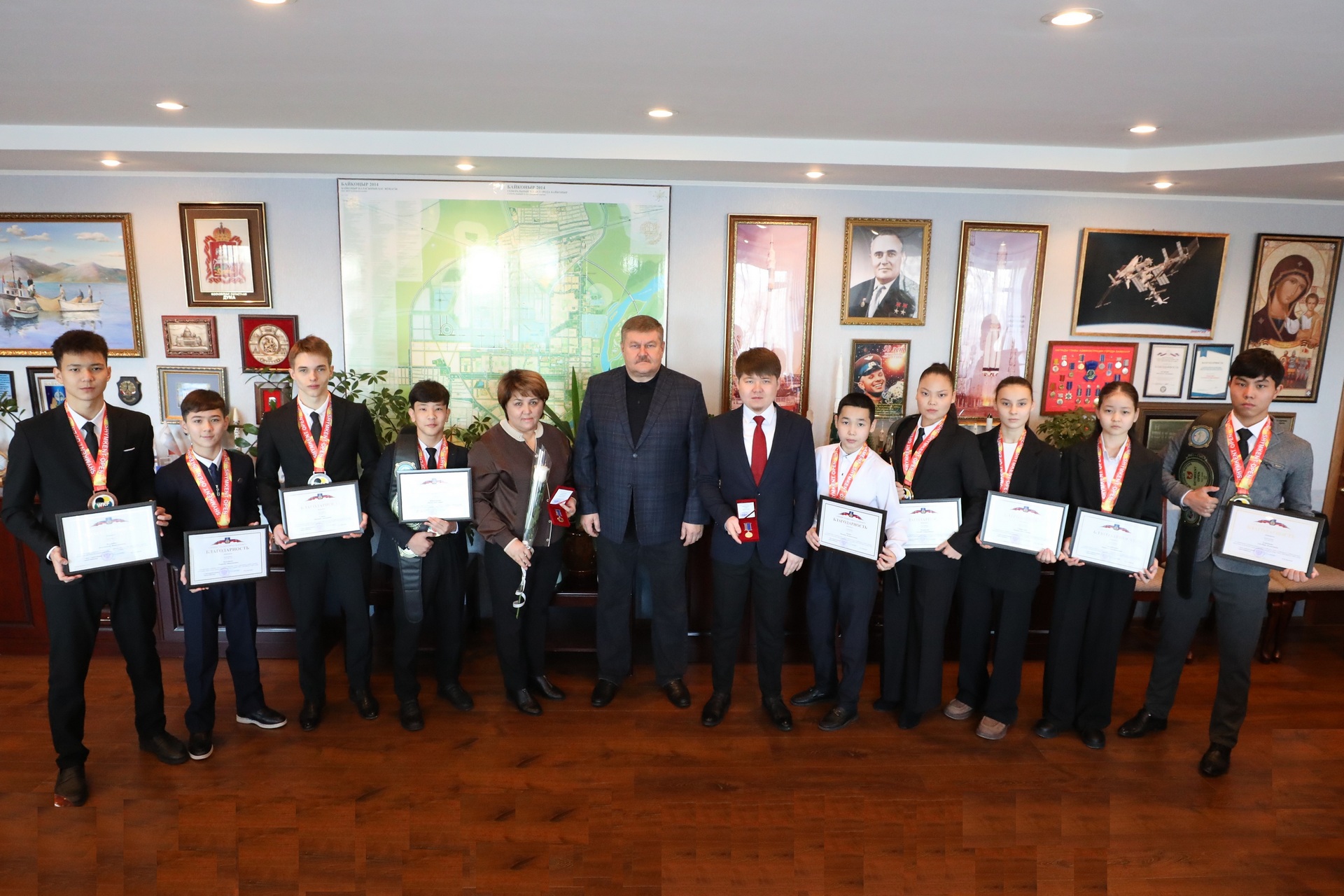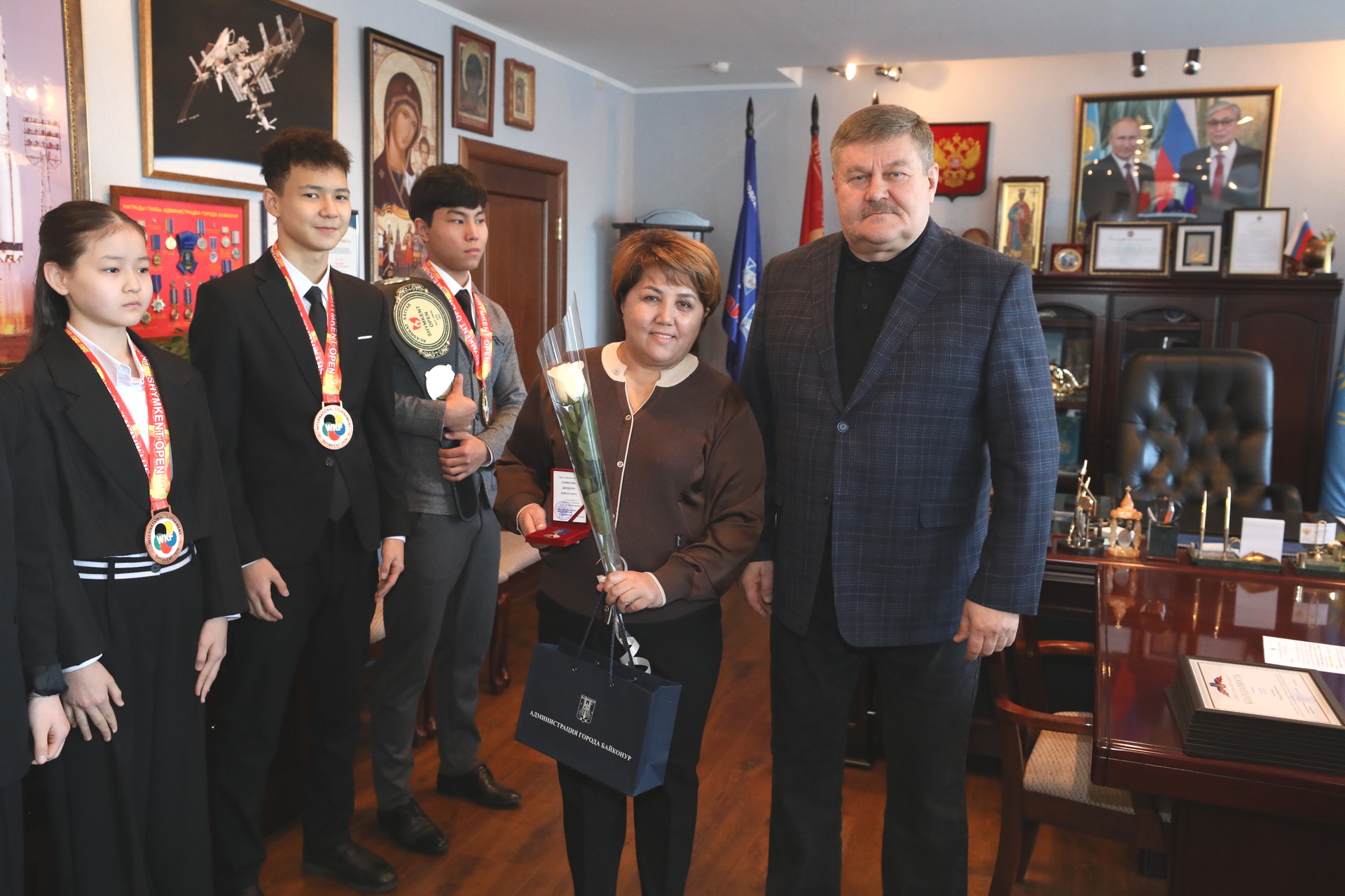 За большой вклад в развитие физической культуры и спорта в городе Байконуре, успехи в воспитании молодежи и подготовку спортсменов, Константин Бусыгин вручил ценный подарок «Стела «Наука и космос» коллективу отделения каратэ Спортивной школы.