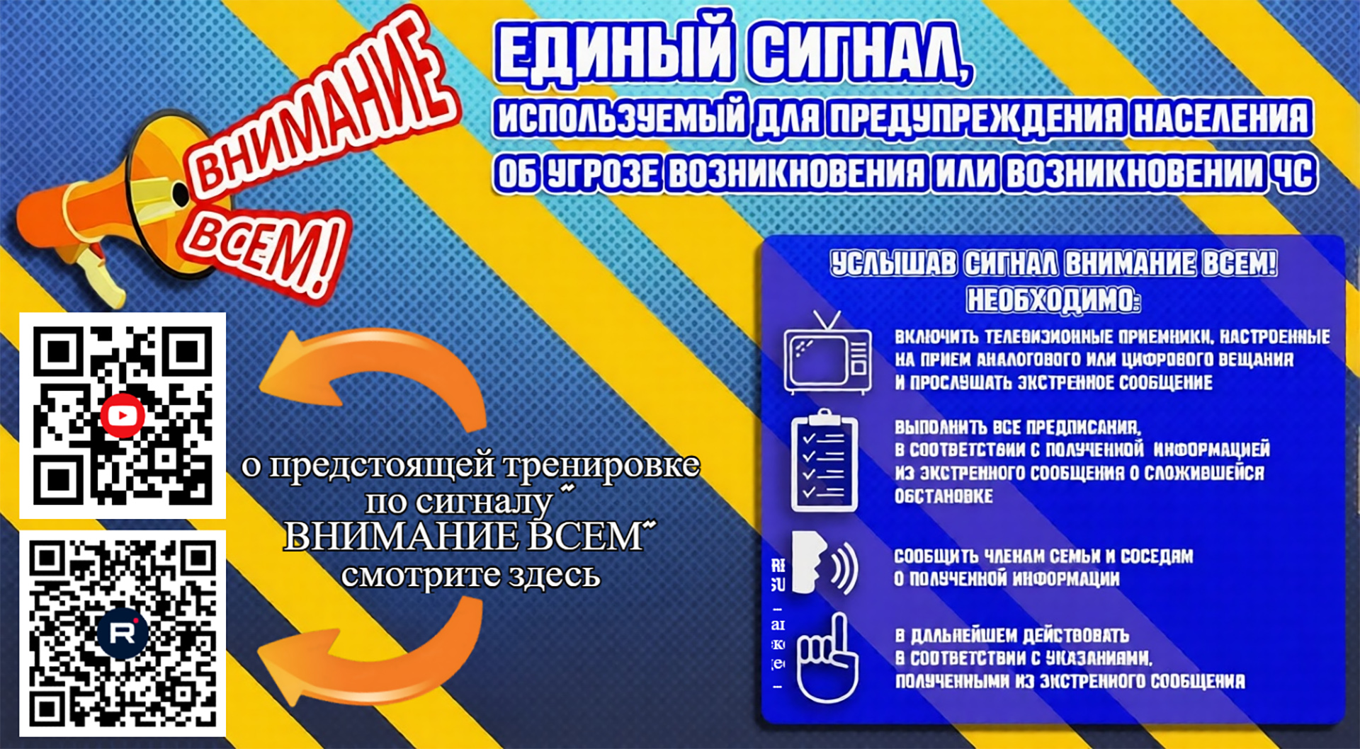 Услышав сигнал «Внимание всем!» вам необходимо включить телевизоры и просмотреть информационное сообщение. Информационное сообщение будет транслироваться: