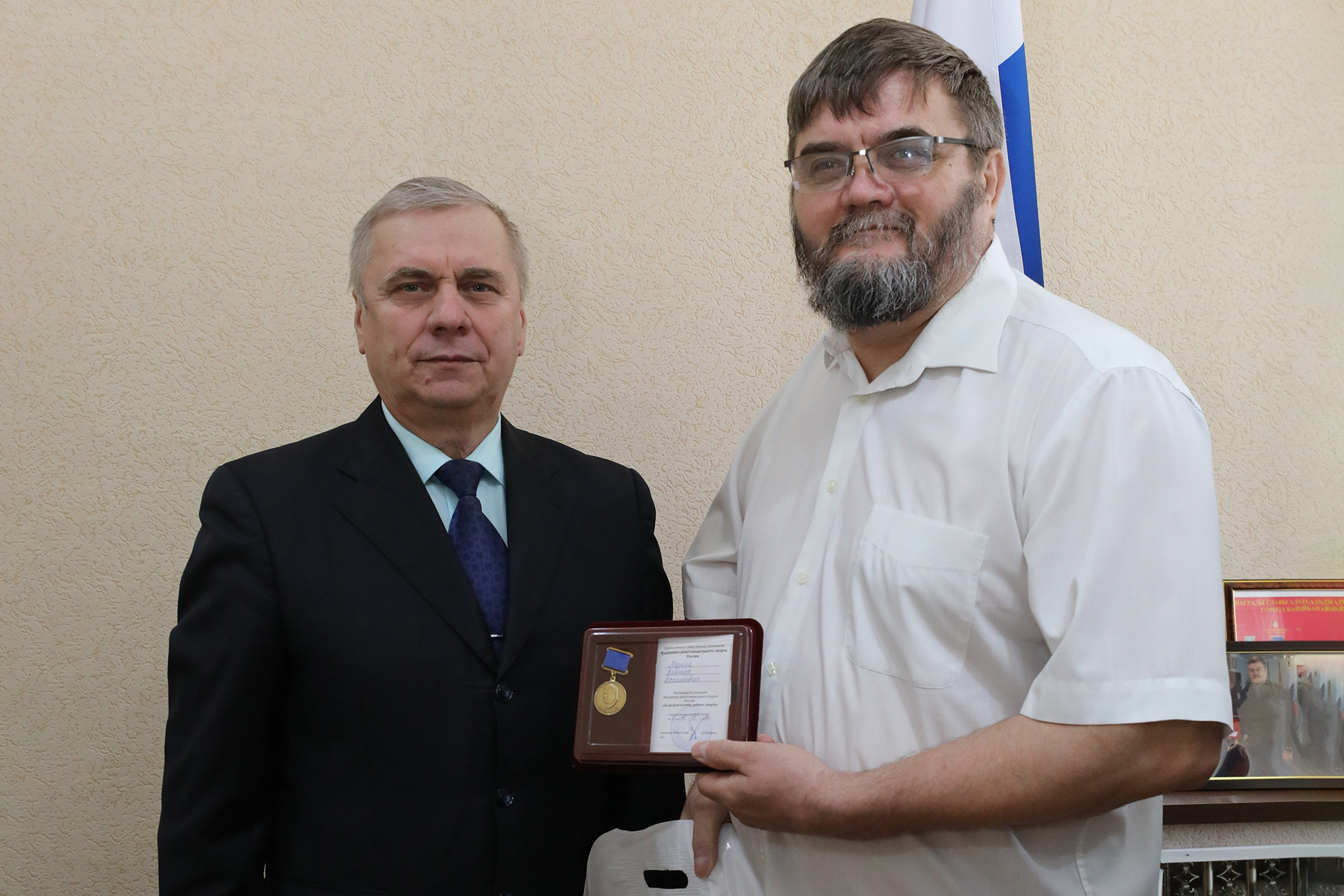 Решением президиума Федерации ракетомодельного спорта России этой высокой чести удостоены восемь байконурцев: Дмитрий Шаталов, Алексей Коряпин, Куаныш Айменов, Геннадий Дмитриенко, Евгений Прощалыгин и Виктор Мазепа из лицея «МКШ им. В.Н. Челомея», Юрий Бичин из средней школы № 10 им. В.П. Бармина и Николай Левин из Военного комиссариата города Байконура. Они внесли неоценимый вклад в подготовку, организацию и проведение международных соревнований по ракетомодельному спорту, а также подготовили чемпионские команды школьников и взрослых, и сами неоднократно становились призерами международных первенств.