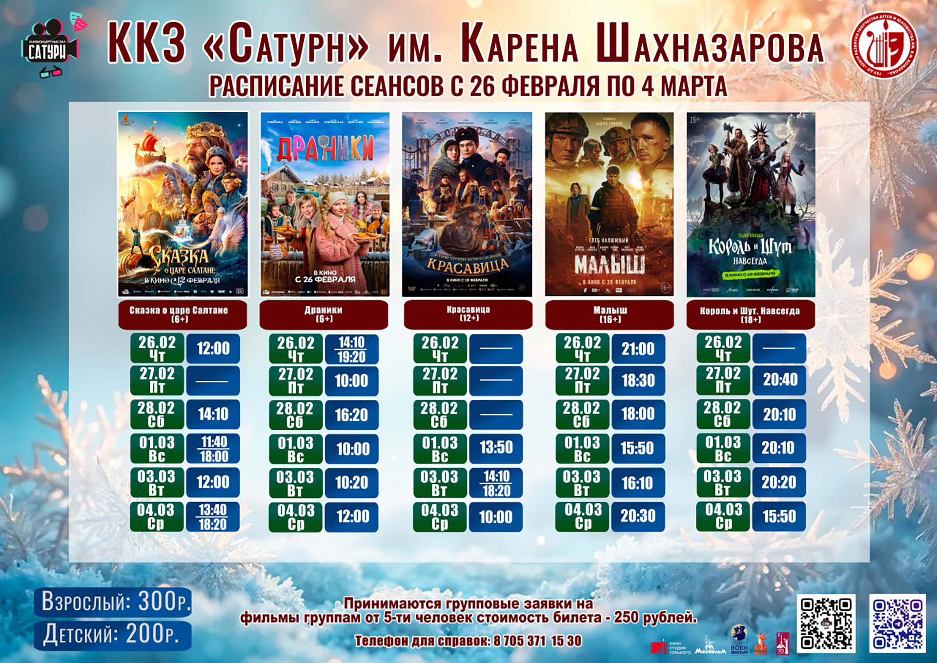 26.02.2026  Киноконцертный зал «Сатурн» приглашает жителей и гостей города на просмотр фильмов