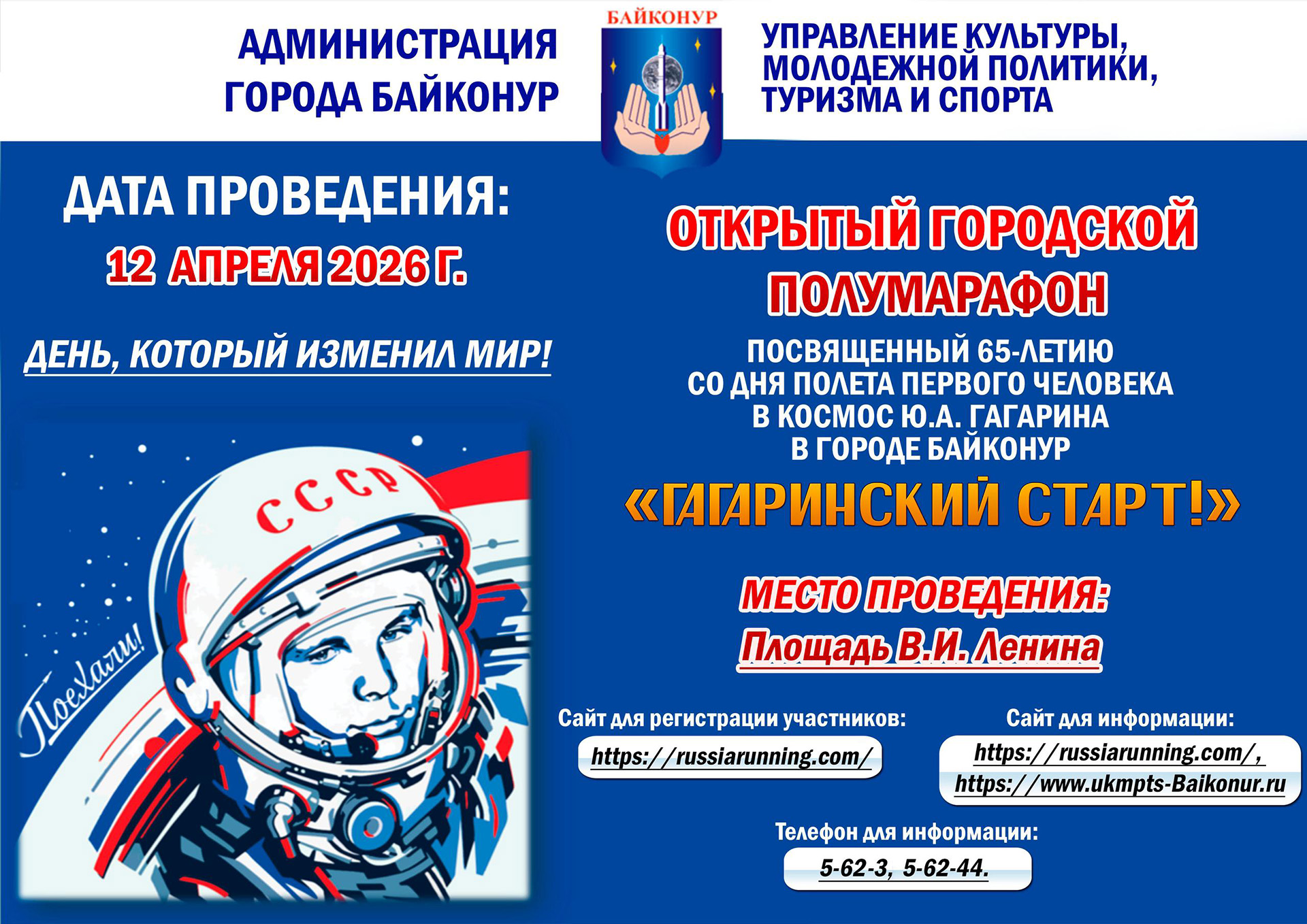 Началась регистрация на Открытый городской полумарафон «Гагаринский старт!», посвященный 65-летию со дня полета первого человека в космос Ю.А. Гагарина, который пройдет 12 апреля.