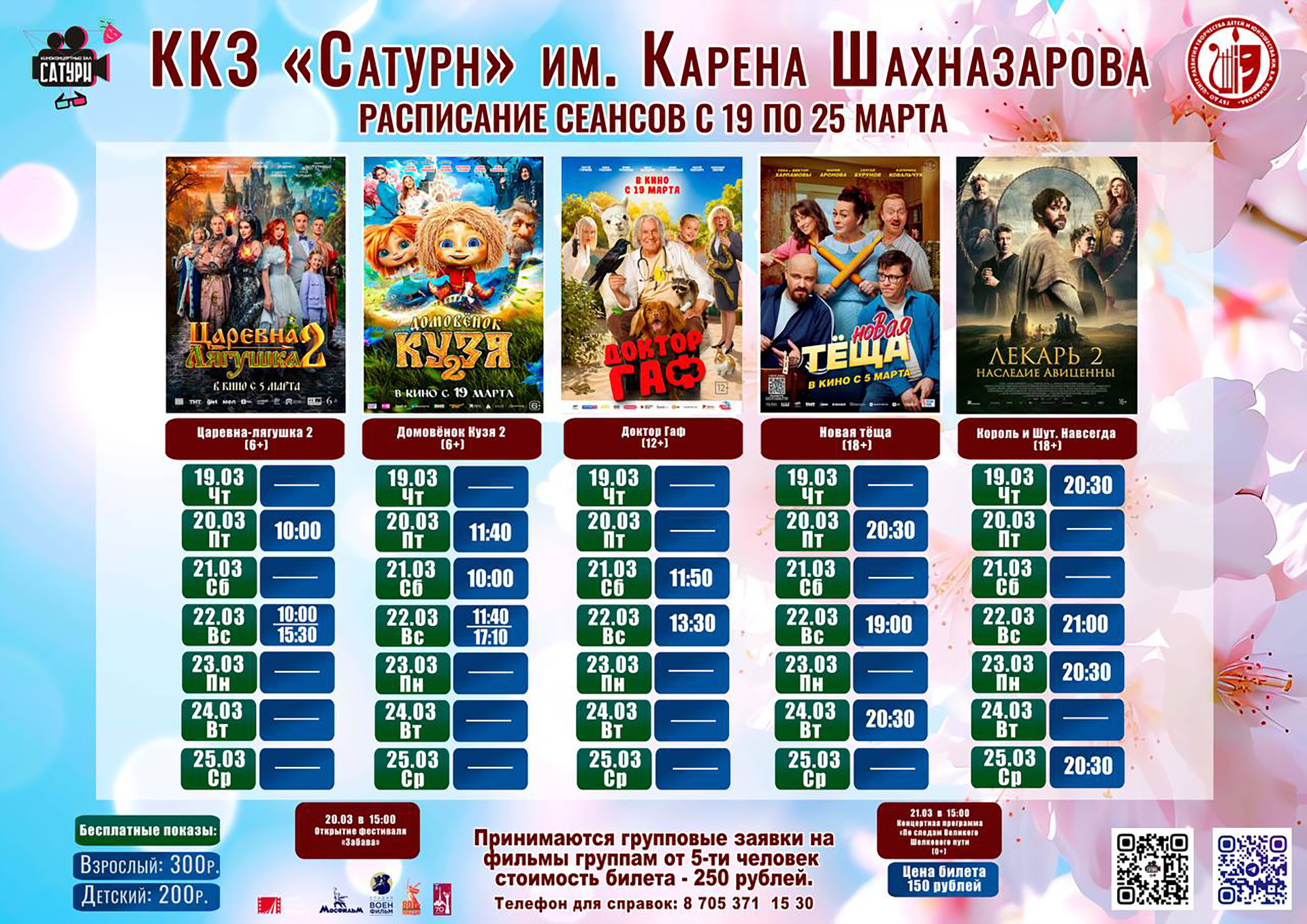 Киноконцертный зал «Сатурн» приглашает жителей и гостей города Байконура на просмотр фильмов. Расписание фильмов на следующую неделю представлено ниже.