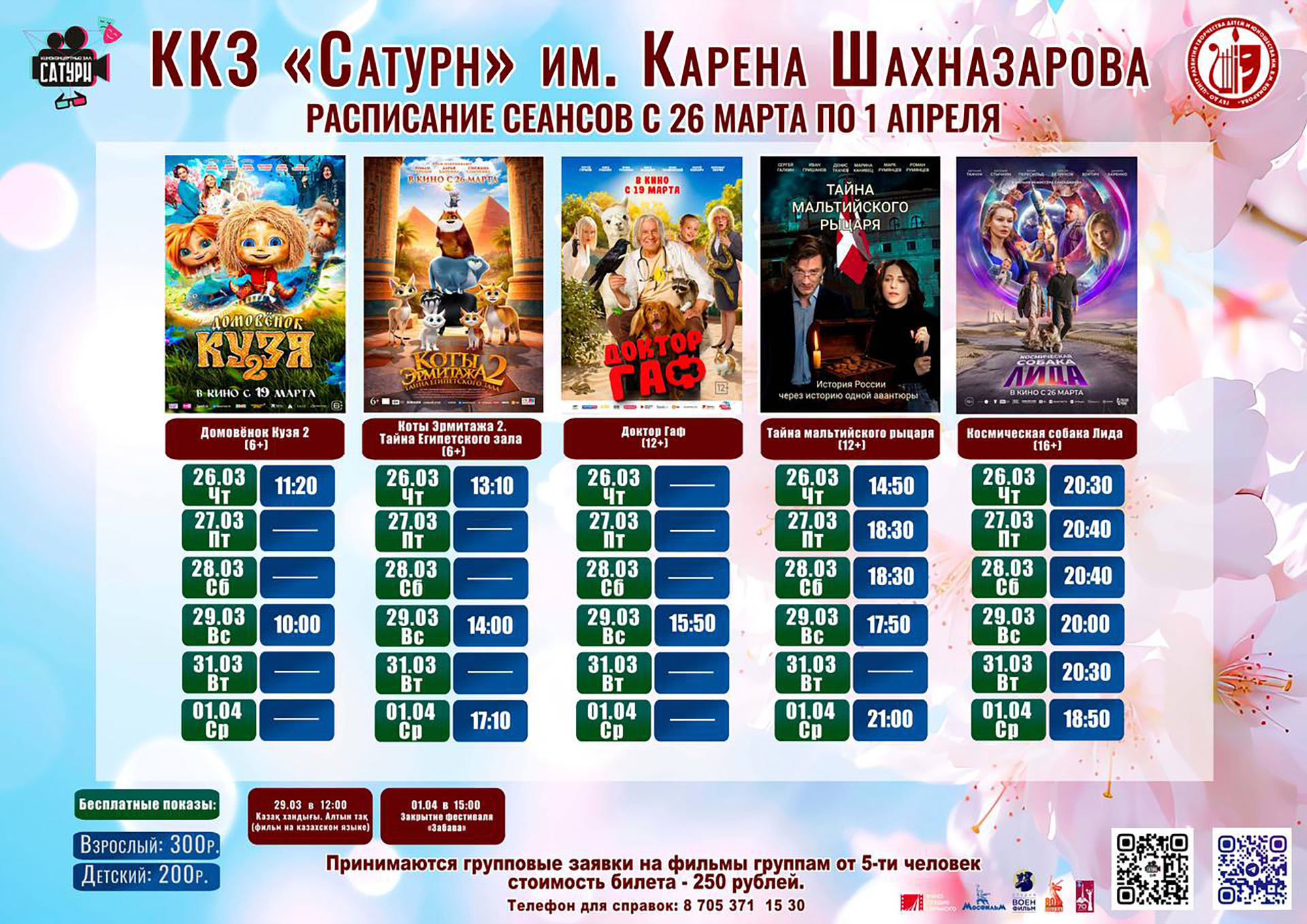 Киноконцертный зал «Сатурн» приглашает жителей и гостей города Байконура на просмотр фильмов. Расписание фильмов на следующую неделю представлено ниже.