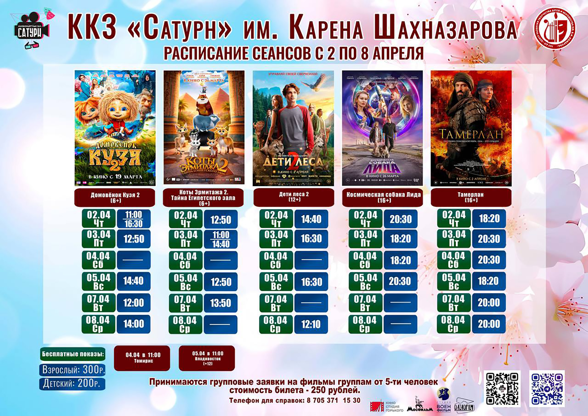 Киноконцертный зал «Сатурн» приглашает жителей и гостей города Байконура на просмотр фильмов. Расписание фильмов на следующую неделю представлено ниже.