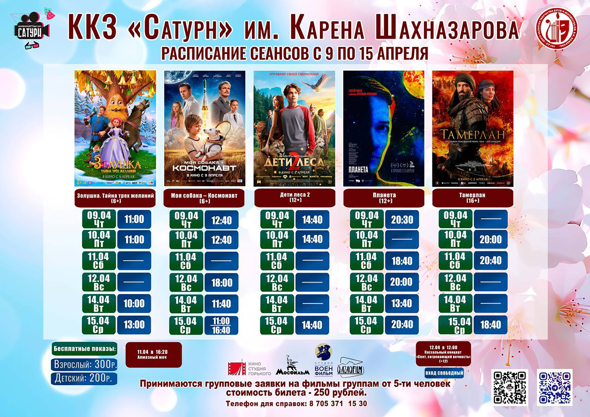 Принимаются групповые заявки на фильмы 6+ и 12+, группам от десяти человек стоимость билета – 100 рублей.