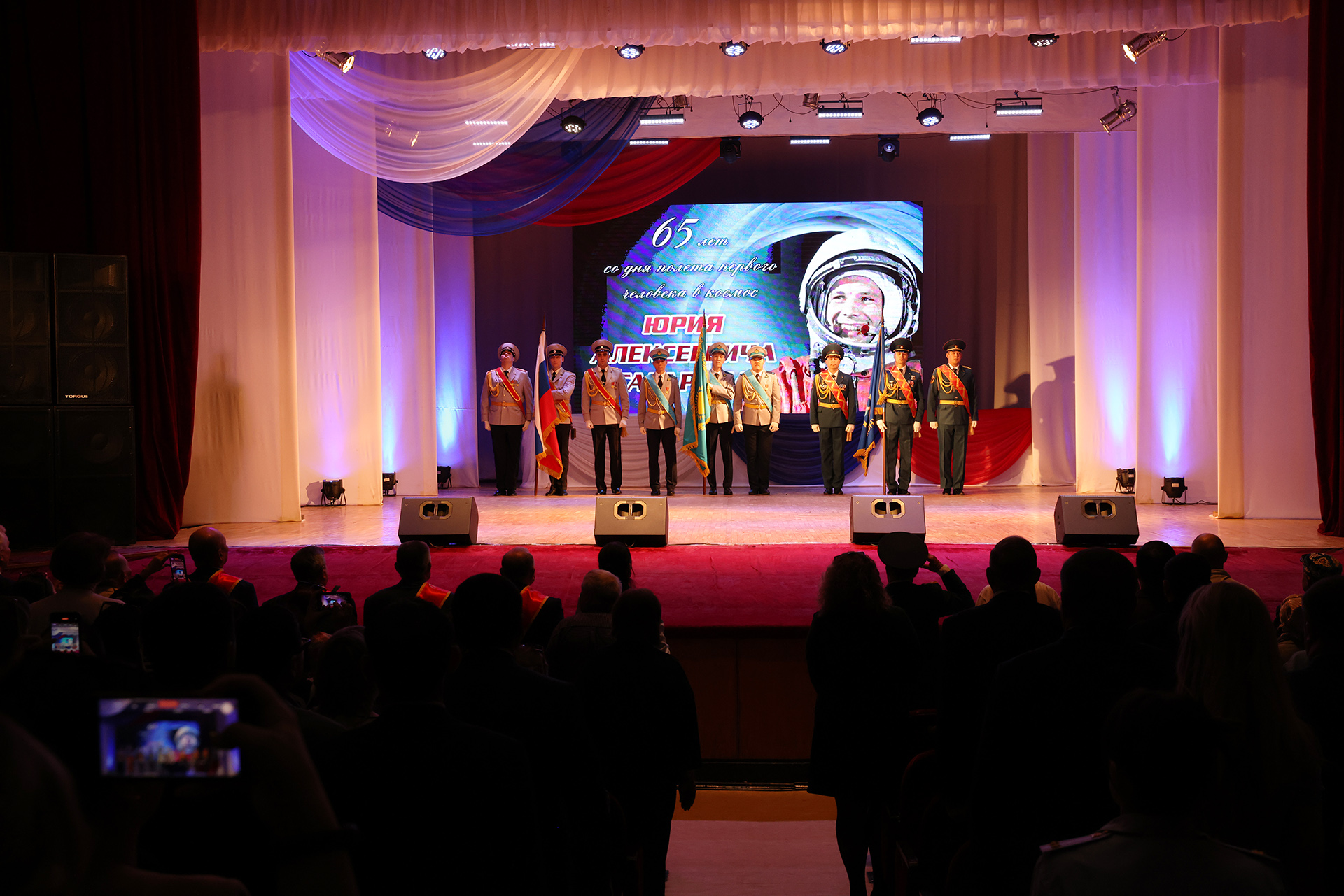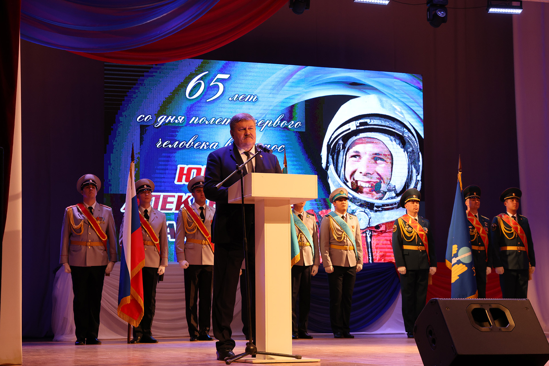 10 апреля в большом зале Городского Дворца культуры состоялось торжественное собрание, посвященное 65-летию первого полета человека в космос – Юрия Алексеевича Гагарина. Торжественное собрание началось с внесения государственных флагов Российской Федерации, Республики Казахстан и флага города Байконура. В зале прозвучали государственные гимны России и Казахстана в исполнении артистов Городского Дворца культуры, задав торжественный тон всему событию. С приветственным словом к собравшимся обратился глава администрации города Байконура Константин Бусыгин. В своей речи он отметил значимость подвига Юрия Гагарина, подчеркнув особую роль Байконура в истории мировой космонавтики и поздравил с юбилейной датой жителей города.