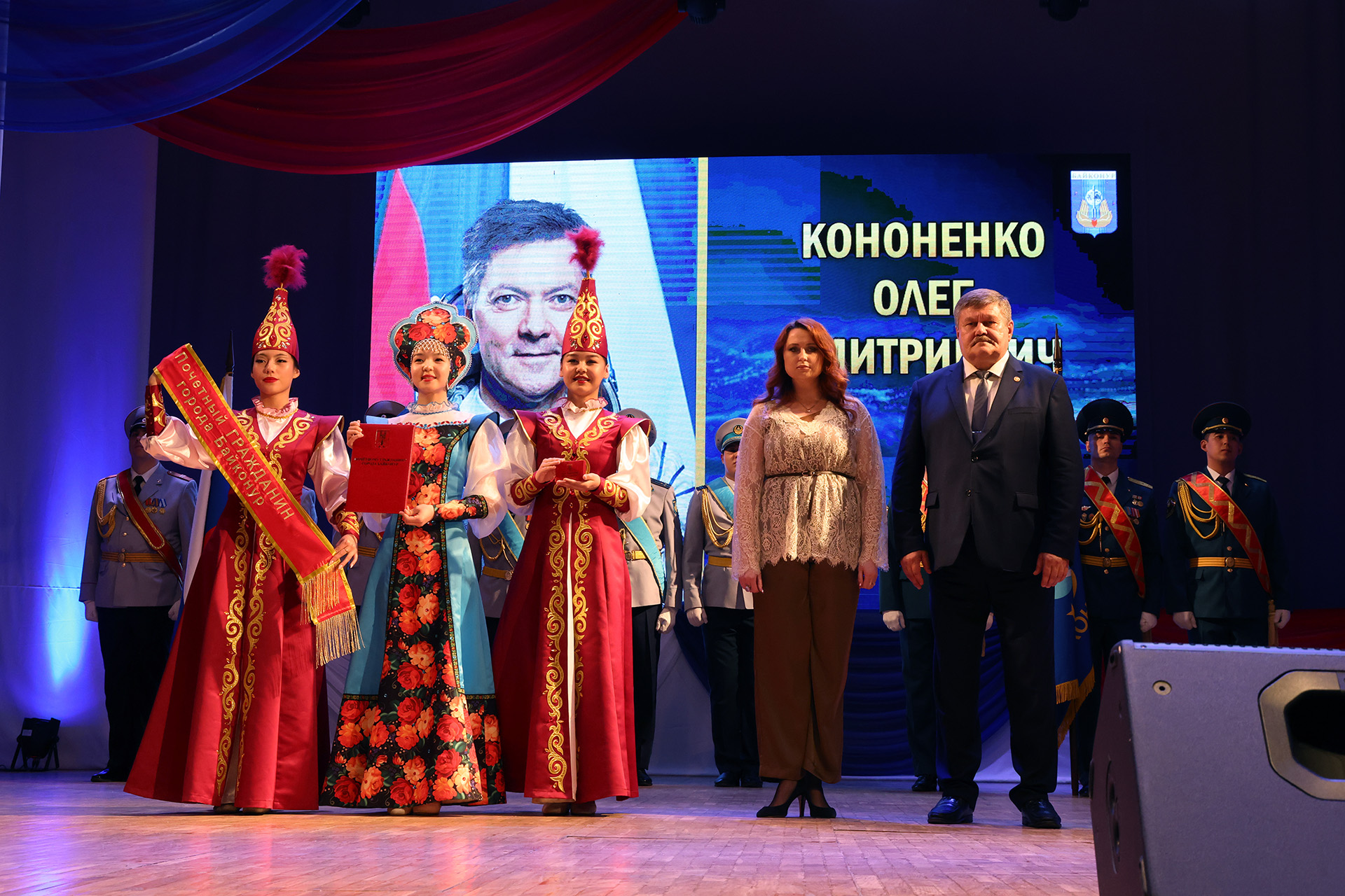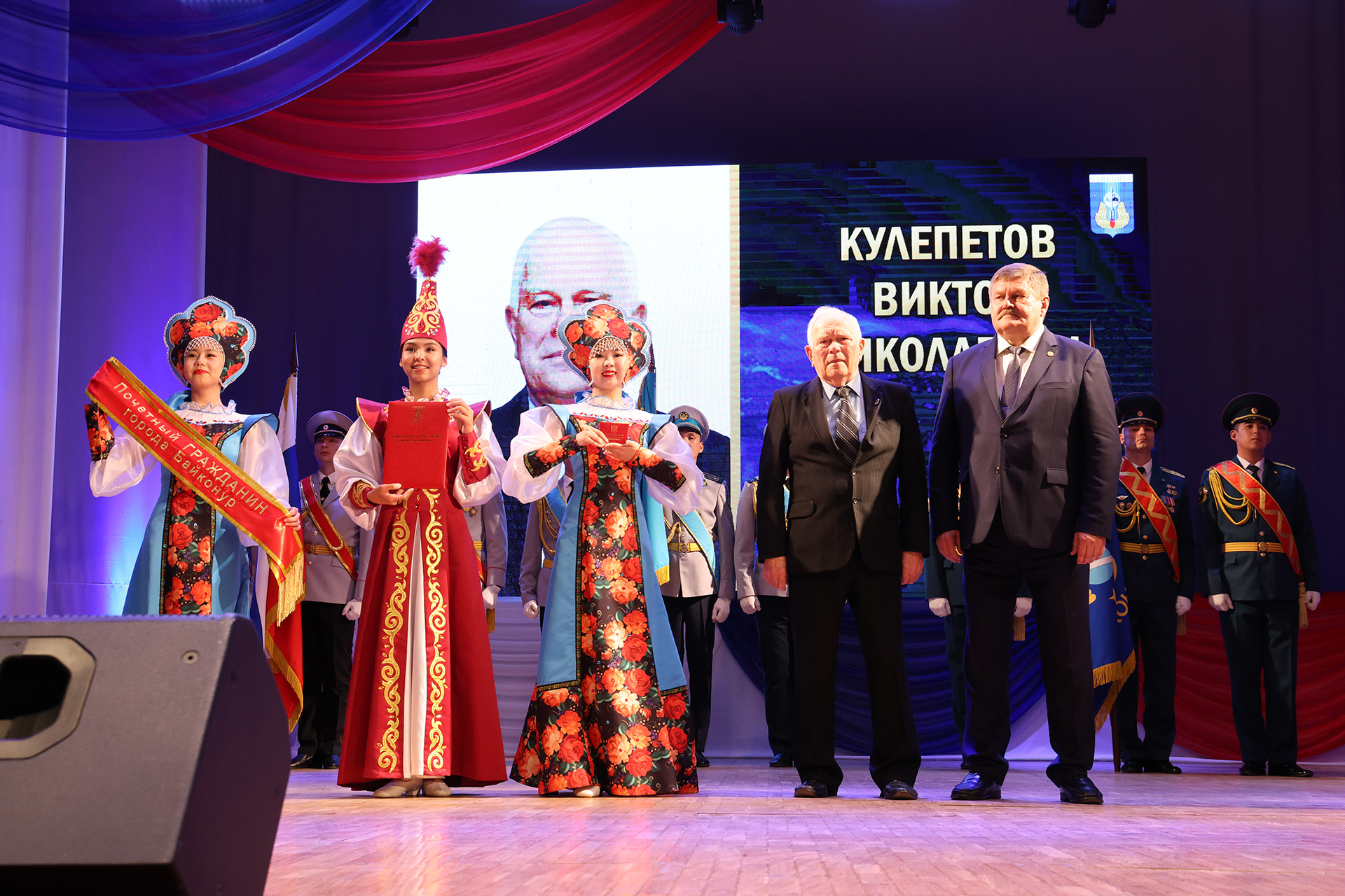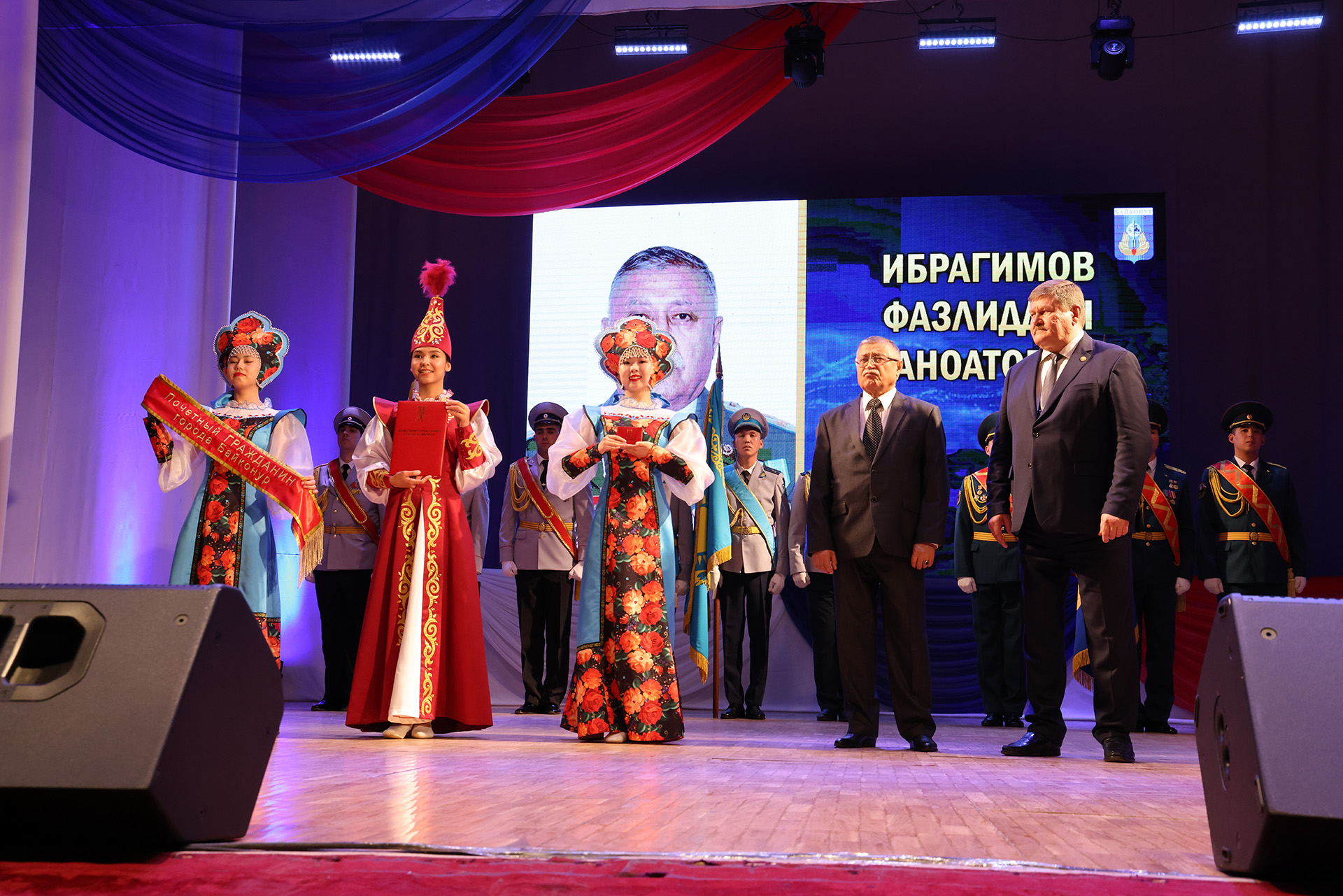 Одним из ключевых моментов торжественного собрания стала церемония присвоения звания «Почетный гражданин города Байконур». В этом году за многолетний труд и верность традициям космодрома соответствующие знаки отличия и удостоверения были вручены Фазлиддину Ибрагимову, Олегу Кононенко, Виктору Кулепетову. Церемонию провел глава города.