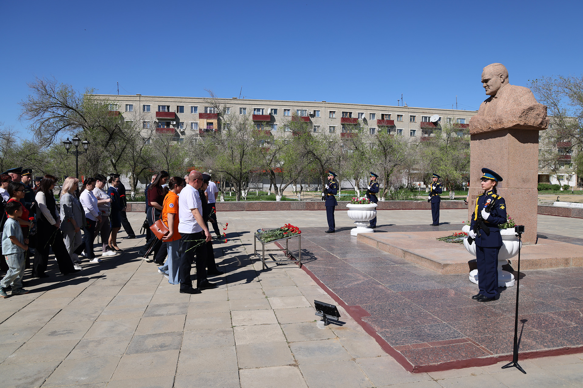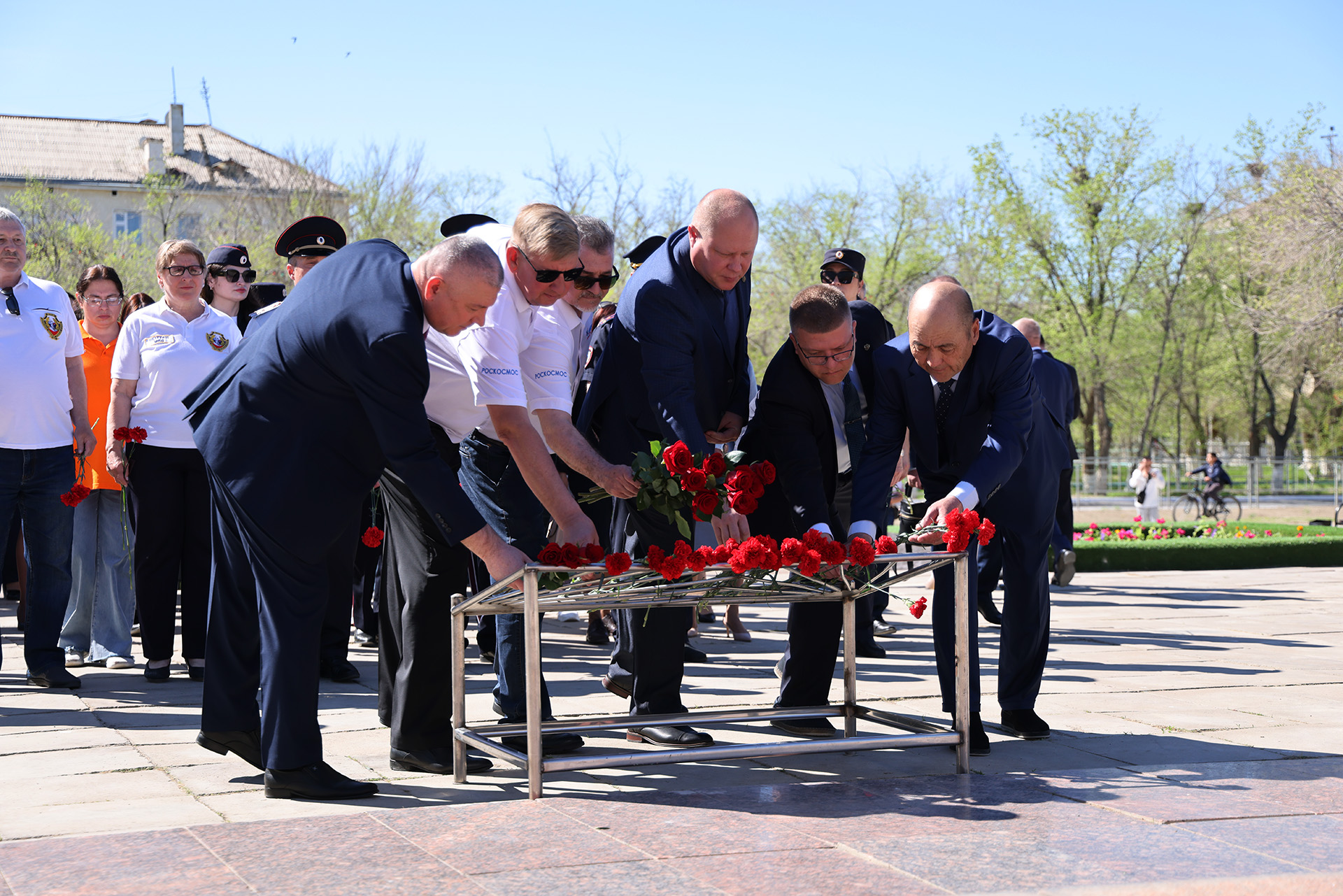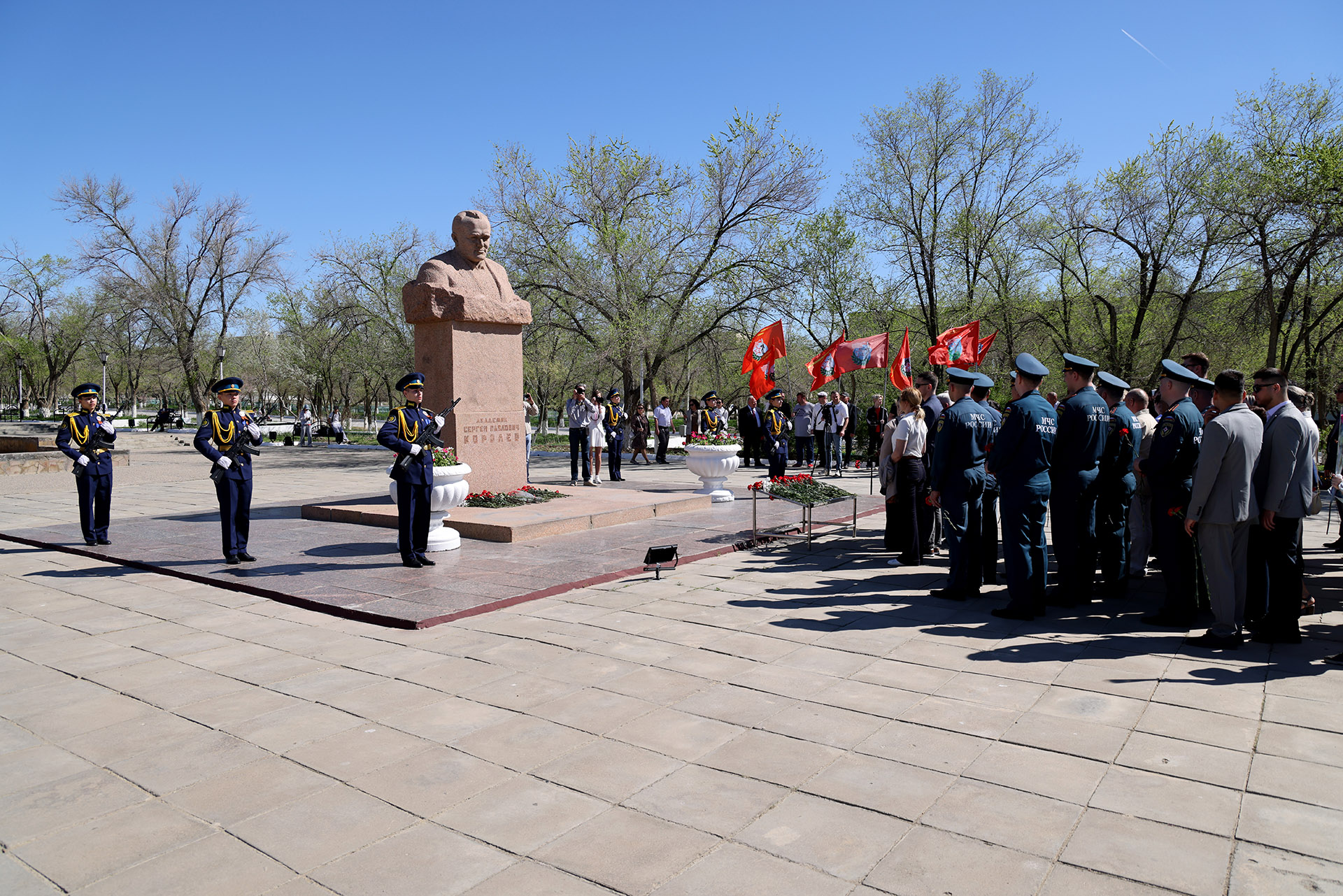 После завершения митинга у памятника Юрию Гагарину, участники праздничных мероприятий в честь 65-летия первого полета человека в космос перешли на площадь Королёва, где возложили цветы к бюсту выдающегося конструктора, создавшего ракету-носитель и космический корабль для полётов человека в космос.