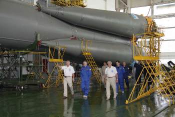 Экипажи посетили монтажно-испытательный корпус площадки 112, где осмотрели ракету-носитель "Союз-ФГ", которая должна доставить на орбиту ТПК "Союз ТМА-М", и смогли пообщаться со специалистами, которые проводят работы по подготовке РН.