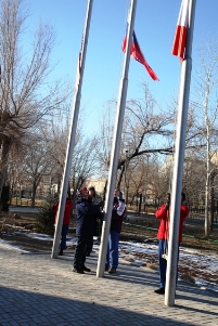 Сегодня утром на Байконуре в испытательном учебно-тренировочном комплексе ЦПК им.Ю.А.Гагарина (пл. 17) основной и дублирующий экипажи ПКК «Союз ТМА-20» - Дмитрий Кондратьев, Паоло Несполи, Кэтрин Колман и Анатолий Иванишин, Сатоши Фурукава, Майкл Фоссум - подняли флаги государств – участников космического полёта. Эта традиция у космонавтов появилась давно и никогда не нарушалась.