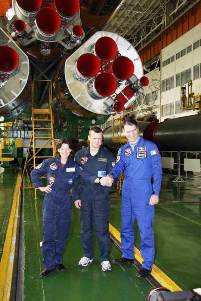 Сегодня основной и дублирующий экипажи пилотируемого космического корабля «Союз ТМА-20» посетили монтажно-испытательный корпус площадки 112 космодрома, где осмотрели ракету-носитель «Союз-ФГ», которой предстоит стартовать в космос 15 декабря. Руководители самарского «ЦСКБ-Прогресс» рассказали космонавтам об особенностях устройства ракеты и сфотографировались вместе с космонавтами на фоне двигательной установки ракеты. «Потрогать» «свою» ракету после второй тренировки – одна из предстартовых традиций, появившихся на космодроме недавно.