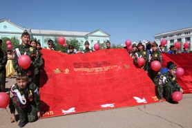 Затем на центральной площади состоялась городская акция «Спасибо за Победу». Школьники вынесли на площадь алые полотна, на которых были написаны пожелания ветеранам Великой Отечественной войны. В минуту молчания горожане выпустили в небо сотни красных воздушных шаров как дань памяти всем, кто погиб за Победу, как знак благодарности за нашу мирную и счастливую жизнь! Настоятель байконурского православного храма святого великомученика Георгия Победоносца протоирей Сергий и имам торетамской мечети «Жаримбет-Ата» Жарылкасым Бекетов прочли заупокойные молитвы по погибшим в войне и недожавшим до Дня Победы.