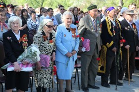 Ветеранов Великой Отечественной войны и жителей города с праздником поздравили заместитель Главы городской администрации Анатолий Петренко, специальный представитель Президента Республики Казахстан на комплексе «Байконур» Сабит Кожаметов, начальник Управления ФКА по космодрому Байконур Евгений Анисимов и директор филиала ФГУП ЦЭНКИ – космический центр «Южный» Сергей Смирнов. Была так же зачитана поздравительная телеграмма из Санкт-Петербурга от главы городской администрации Александра Мезенцева и его отца, ветерана войны Федора Мезенцева.