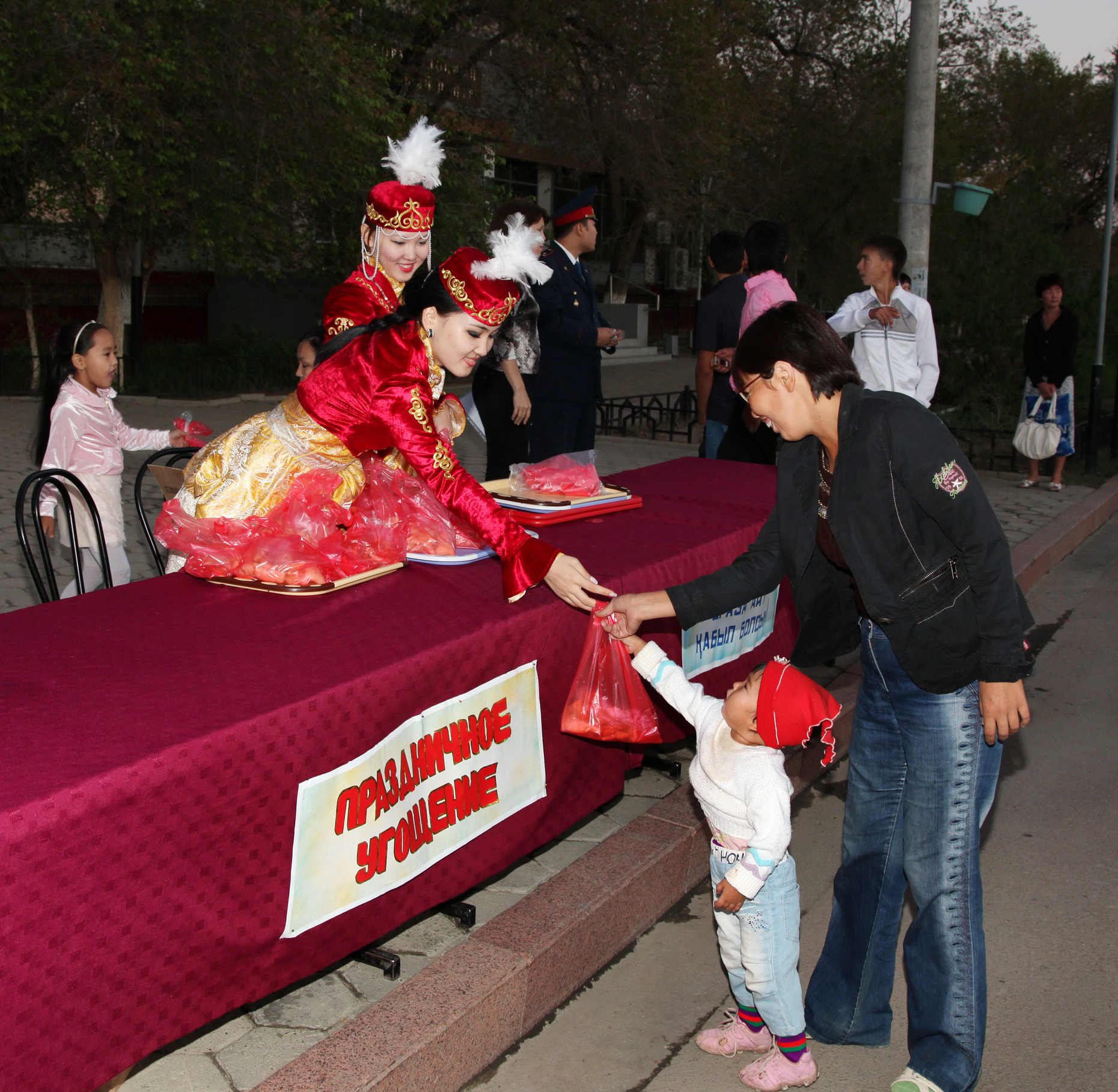 В честь завершения священного для мусульман месяца Рамазан и праздника Ораза Айт, совпавшего с Днем Конституции РК, гостей праздника угощали баурсаками.