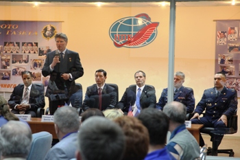 По сложившейся традиции после утверждения основного экипажа Глава администрации Александр Мезенцев вручил золотые памятные знаки «Байконур» впервые стартующим с космодрома Байконур – космонавту-испытателю С.Ревину и астронавту Д.Акаба.
