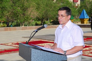 Глава города, обращаясь к байконурцам, сказал следующее: «Дорогие байконурцы и гости города, уважаемые ветераны, сотрудники предприятий космической отрасли и городских предприятий, молодежь!