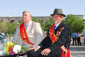 Глава администрации Александр Мезенцев вручил отличительные знаки Почетного гражданина города Байконур Жуматаю Мустафаеву – ветерану Великой Отечественной войны, ветерану труда и космодрома; Александру Ивановичу Болысову, полковнику в отставке, секретарю Подкомиссии по комплексу «Байконур» Межправительственной комиссии по сотрудничеству между Россией и Казахстаном.