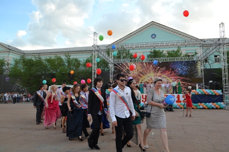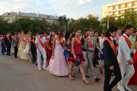 23 июня в 9 часов вечера на центральной площади собрались около 700 выпускников общеобразовательных школ города, их родители и друзья. Колонны выпускников возглавляли педагоги, вложившие много сил и знаний в каждого своего ученика. Со словами напутствия во взрослую жизнь к ребятам обратились Глава администрации города Байконур Александр Мезенцев, директор Космического Центра «Южный» Евгений Анисимов, начальник Управления образованием Марина Овчинникова. Они пожелали выпускникам всего самого наилучшего в жизни, не забывать свою малую родину и всегда достойно нести почетное звание - байконурец.
