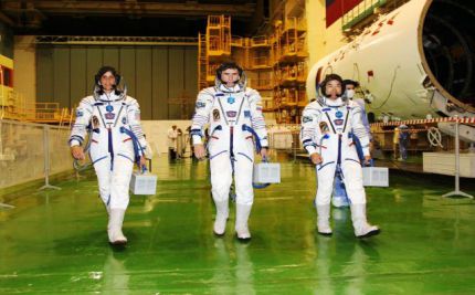 Затем Юрий Маленченко, Санита Уилльямс и Акихико Хошиде провели тренировку в транспортном пилотируемом корабле «Союз ТМА-05М» уже в скафандрах.