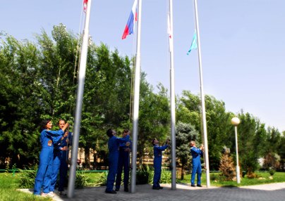 4 июля на Байконуре в НИИ ЦПК им.Ю.А.Гагарина экипажи 32/33 экспедиции на МКС подняли флаги государств - участников программы космического полета.