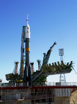 После доставки РКН с ТПК на стартовый комплекс площадки 1 («Гагаринский старт») специалисты предприятий ракетно-космической отрасли России выполнили ее установку в пусковую систему и приступили к выполнению операций по программе первого стартового дня.