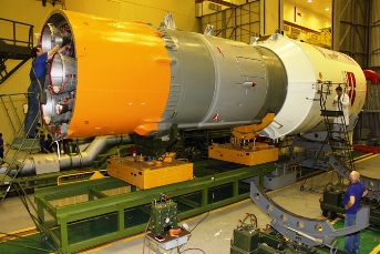 18 июля в монтажно-испытательном корпусе площадки 31 космодрома Байконур расчеты предприятий Роскосмоса провели общую сборку ракеты космического назначения: к «пакету» из двух ступеней ракеты-носителя «Союз-ФГ» была пристыкована сборка из третьей ступени ракеты и космической головной части (разгонный блок «Фрегат» и кластер из пяти космических аппаратов под головным обтекателем). После завершения механической стыковки была выполнена сборка электрических соединений и смонтированы трубопроводы для термостатирования КГЧ.