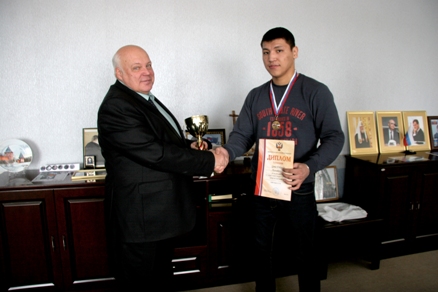Во время встречи Александр Мезенцев вручил Олжасу Акимову удостоверение звания «Почетный деятель спорта Республики Казахстан». Почетного звания тренер удостоен Агентством РК по делам спорта и физической культуры в сентябре 2012 года.