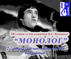 27 января. ГДК (малый зал). 17.00. Концерт КСП «Звездный», посвященный 75-летию со дня рождения Владимира Высоцкого. Вход свободный.