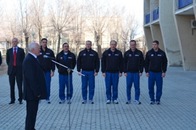 Присутствовавшие на церемонии поднятия флагов исполняющий обязанности Главы администрации города Байконур Анатолий Петренко, начальник Управления Роскосмоса на Байконуре Анатолий Белоконь и заместитель директора филиала ФГУП ЦЭНКИ – Космический центр «Южный» Юрий Гришанов пожелали космонавтам выполнения всех поставленных задач, удачного старта и благополучного возвращения на Землю. Представители руководства города и космодрома заверили космонавтов и астронавтов, что все городские структуры и предприятия Роскосмоса готовы к обеспечению предстоящего запуска.