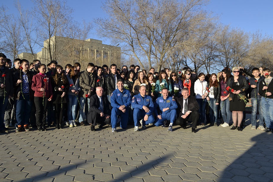 22 марта члены дублирующего экипажа 35/36 экспедиции на МКС совершили экскурсию по городу, ставшую традиционной для космонавтов-дублеров. В сквере имени Юрия Гагарина экипаж и сотрудников Центра подготовки космонавтов приветствовали заместитель Главы городской администрации Анатолий Петренко, который вручил российским космонавтам Олегу Котову и Сергею Рязанскому, а также астронавту НАСА Майклу Хопкинсу серебряные памятные знаки «Байконур» в знак посещения космической гавани. Учащиеся международной космической школы подготовили для гостей запуск моделей ракет, которые они изготовили своими руками. Космонавты возложили цветы к памятнику Юрию Гагарину, и сфотографировались у монумента, и со школьниками.