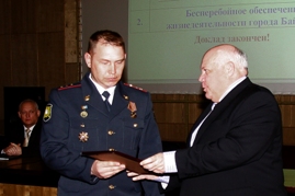 В понедельник, на еженедельном совещании руководителей городских предприятий и учреждений, Глава города Александр Мезенцев вручил почетную грамоту за спасение утопающего и премию старшему прапорщику полиции Александру Пискунову. Случай со спасением утопающего произошел 6 февраля, когда, прибывшие в береговую зону реки Сырдарьи по вызову в дежурную часть УМВД России на комплексе «Байконур», старший прапорщик полиции Александр Пискунов и прапорщик полиции Владимир Цыган вытащили из реки тонувшего мужчину. По ходатайству начальника УМВД России на комплексе «Байконур» Алексея Кузьмина сотрудники полиции были поощрены Главой городской администрации за мужество, самоотверженные действия и отвагу, проявленные при исполнении служебных обязанностей при спасении человека.