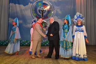 Глава администрации А.Ф.Мезенцев вручил атрибуты звания «Почетный гражданин города Байконур» (удостоверение, памятный адрес, лента) и цветы С.П.Смирнову.