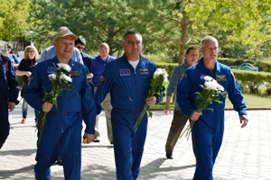 Александр Скворцов уже имеет в своем багаже один космический полет, и не раз бывал на Байконуре. Космонавты возложили цветы к памятнику Юрию Гагарину, и сфотографировались у монумента. Олег Артемьев, который в школьные годы жил и учился на Байконуре, сфотографировался с учащимися средней школы №5 (ранее средняя школа № 211 г. Ленинск, которую в 1986 г. окончил Олег Артемьев).