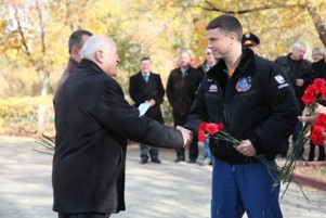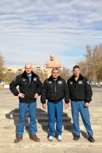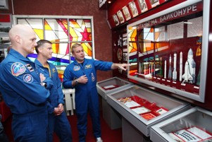 Анатолий Петренко вручил астронавтам Грегори Вайзману и Александру Герсту серебряные памятные знаки «Байконур» в знак посещения космической гавани. Дублеры возложили цветы к памятнику Юрию Гагарину, и сфотографировались у монумента.