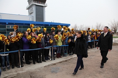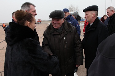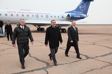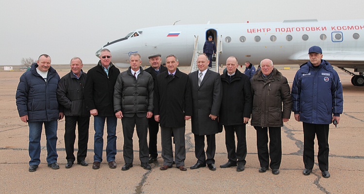 В аэропорту «Крайний» членов основного экипажа - российских космонавтов Александра Скворцова и Олега Артемьева, астронавта НАСА Стивена Свонсона, дублирующий экипаж, в составе которого российские космонавт Александр Самокутяев и Елена Серова, астронавт НАСА Барри Уилмор, приветствовали исполняющий обязанности Главы администрации г.Байконур Анатолий Петренко, начальник Управления Роскосмоса на космодроме Байконур Анатолий Белоконь, представители РКК «Энергия», Центра подготовки космонавтов, а так же учащиеся Международной космической школы.