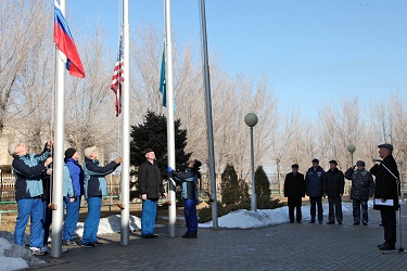 Члены основного экипажа транспортного пилотируемого корабля "Союз ТМА-12М" - космонавты Роскосмоса Александр Скворцов, Олег Артемьев и астронавт НАСА Стивен Свонсон, их дублеры Александр Самокутяев, Елена Серова и Барри Уилмор подняли флаги России, США и Казахстана. Присутствовавшие на церемонии поднятия флагов исполняющий обязанности Главы администрации города Байконур Анатолий Петренко, начальник Управления Роскосмоса по космодрому Байконур Анатолий Белоконь и директор байконурского Департамента Казкосмоса Галымжан Данбаев пожелали экипажу выполнения всех поставленных задач, удачного старта, и благополучного возвращения на Землю. Представители руководства города и космодрома заверили космонавтов и астронавтов, что все городские структуры и предприятия Роскосмоса готовы к обеспечению предстоящего запуска.